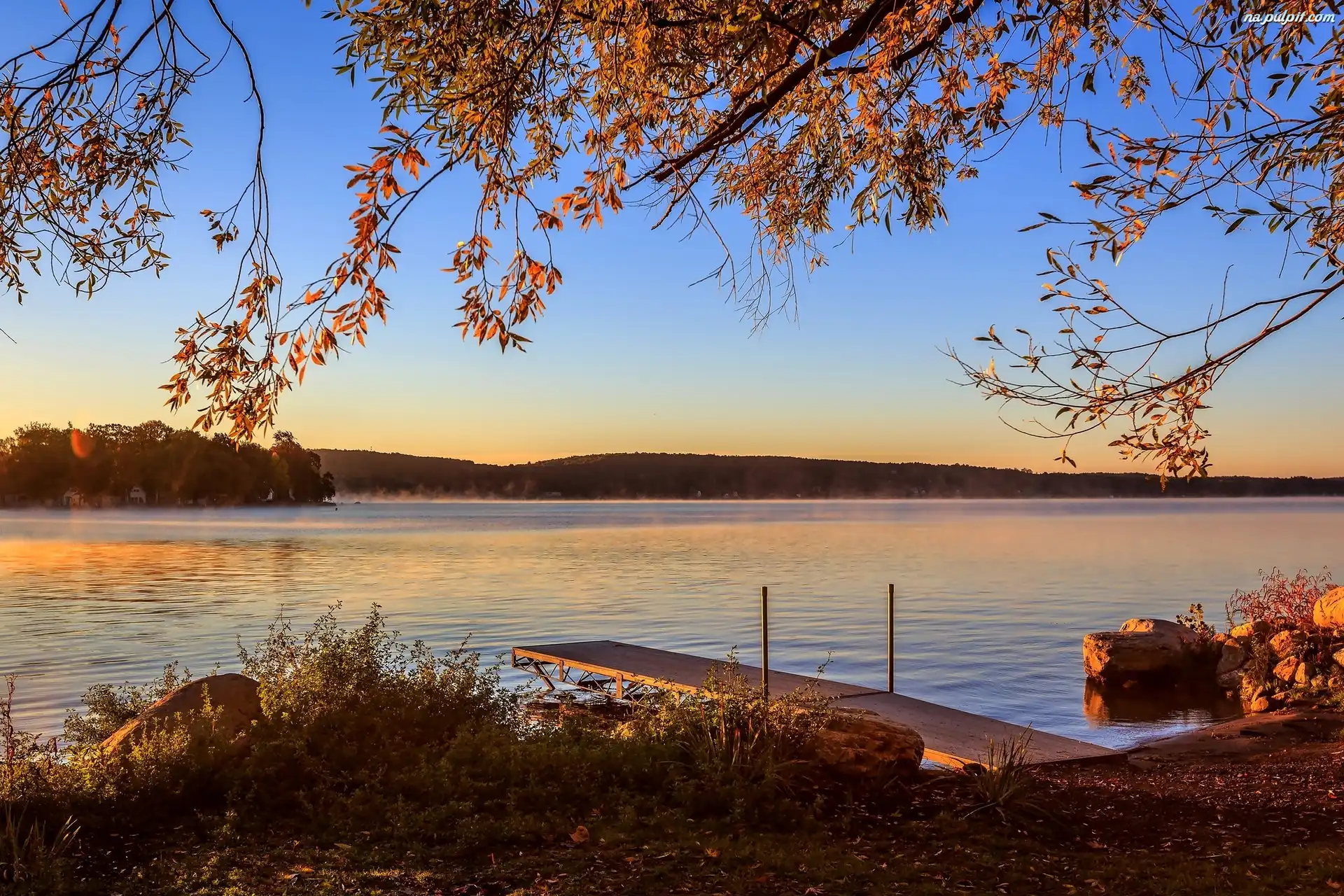 Słońca, Drzewo, Pomost, Jezioro, Wschód