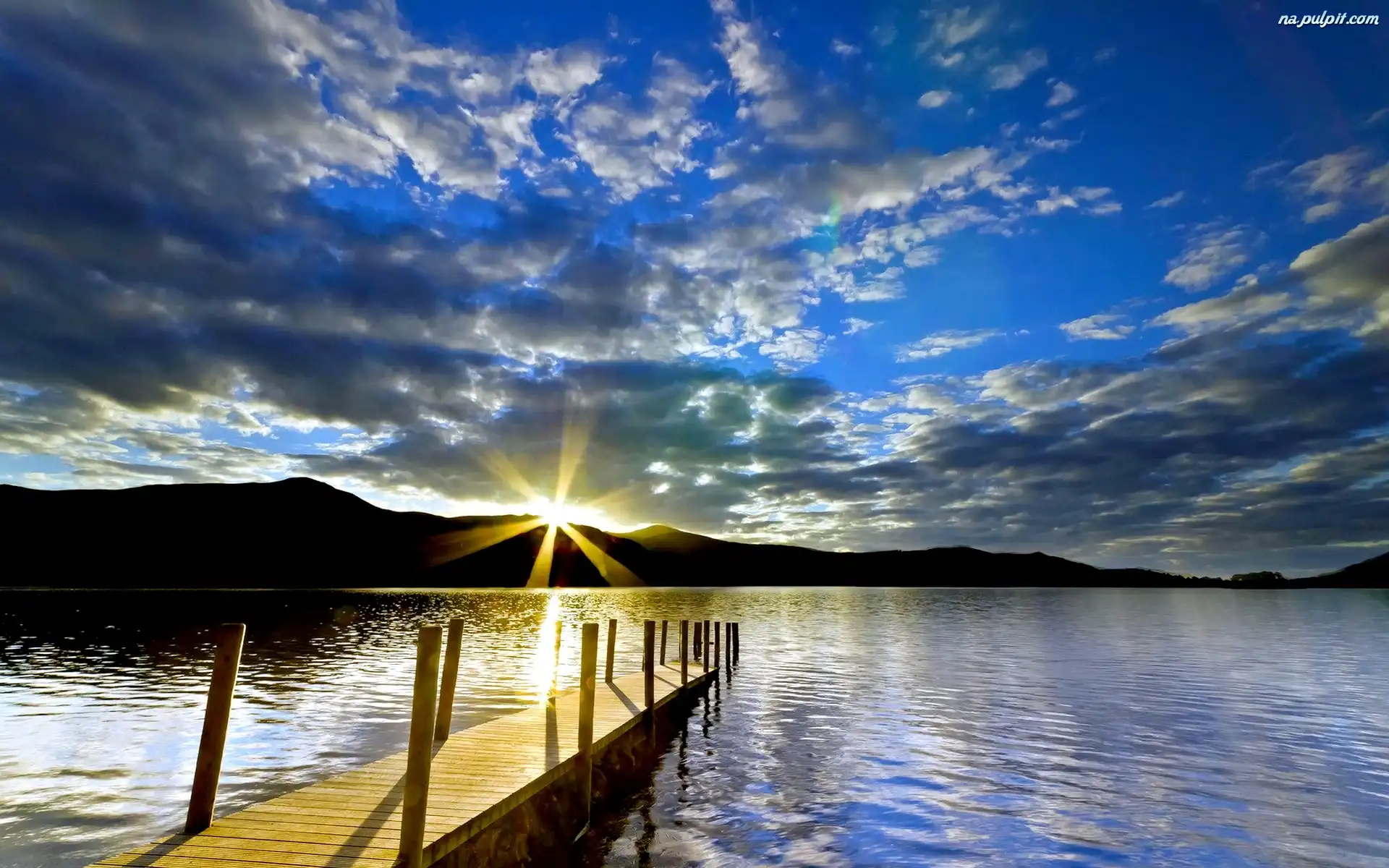 Słońca, Promienie, Pomost, Jezioro, Zachodzącego