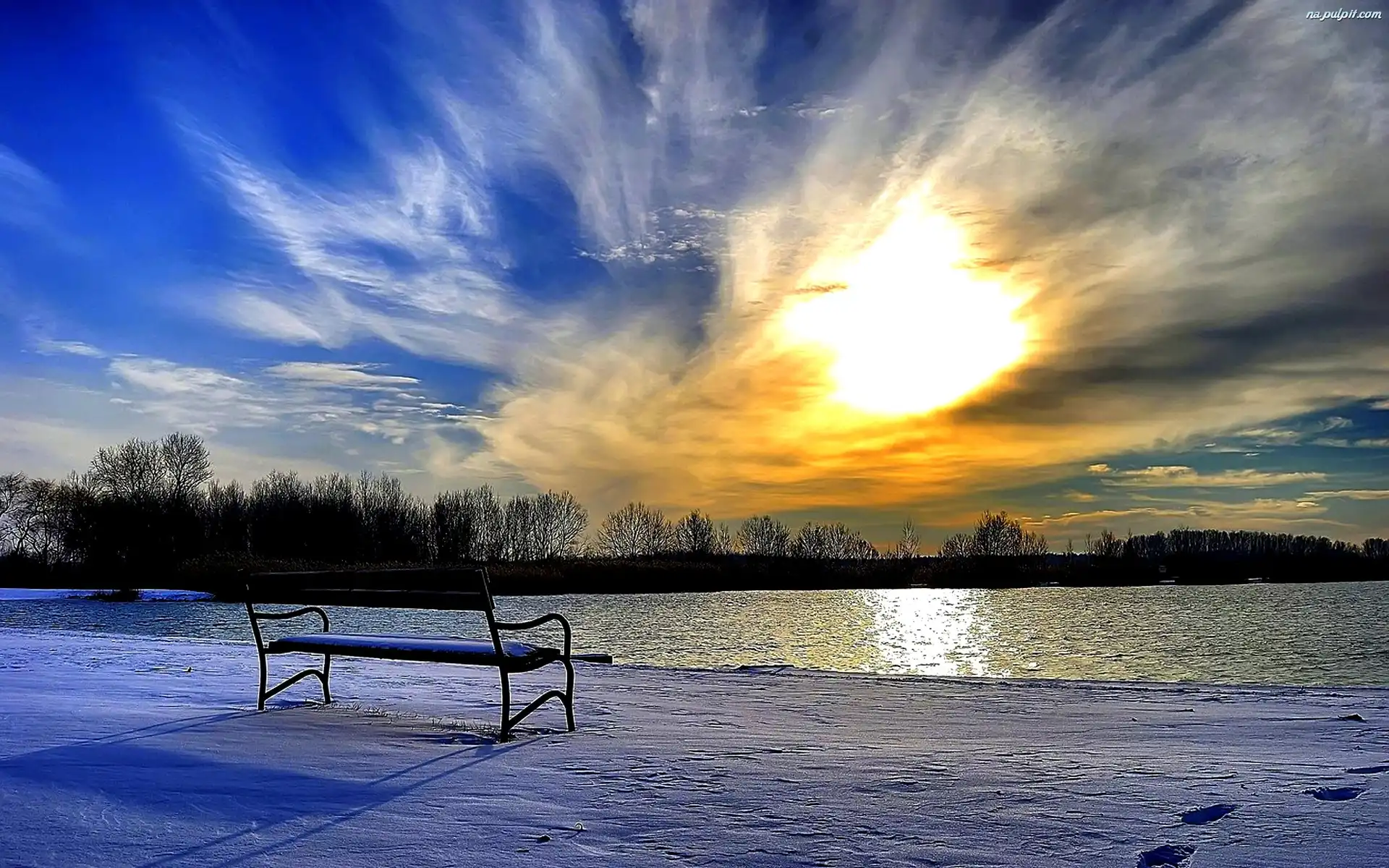 Ławka, Jezioro, Zachód Słońca, Zima Na Pulpit