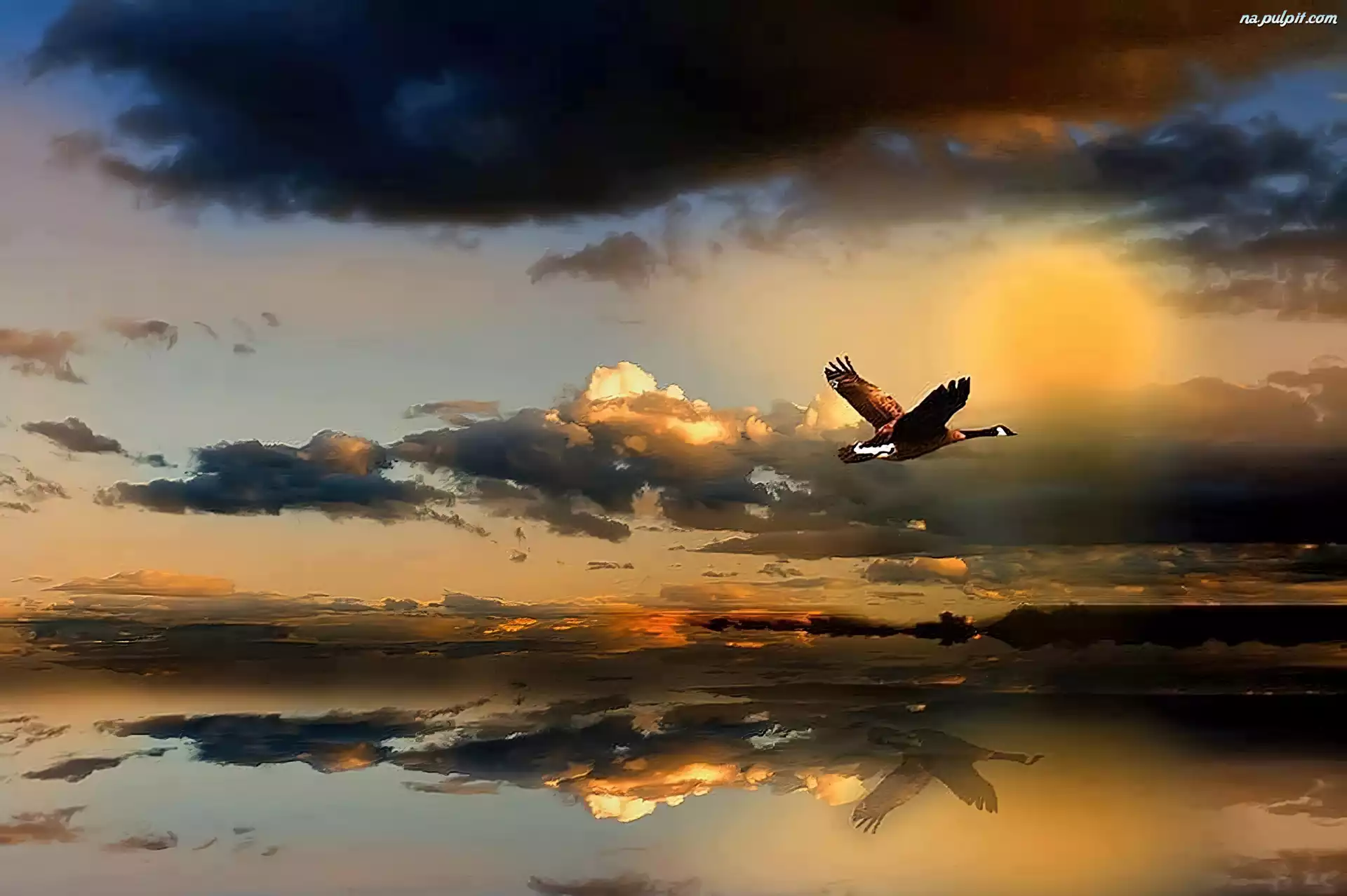 Słońca, Jezioro, Chmury, Kaczka, Zachód