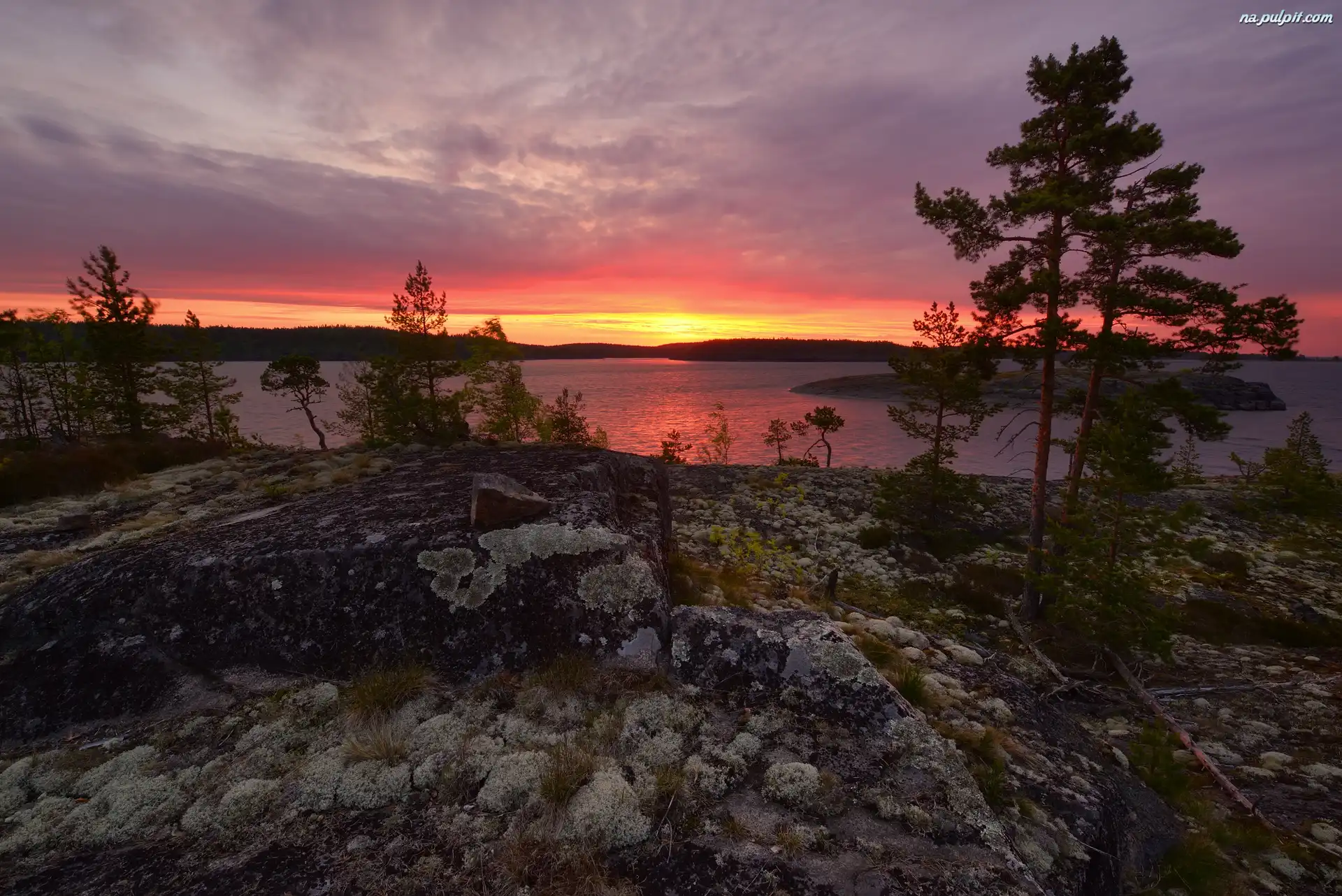 Rosja, Góry, Karelia, Drzewa, Skały, Jezioro Ładoga, Zachód słońca Na Pulpit