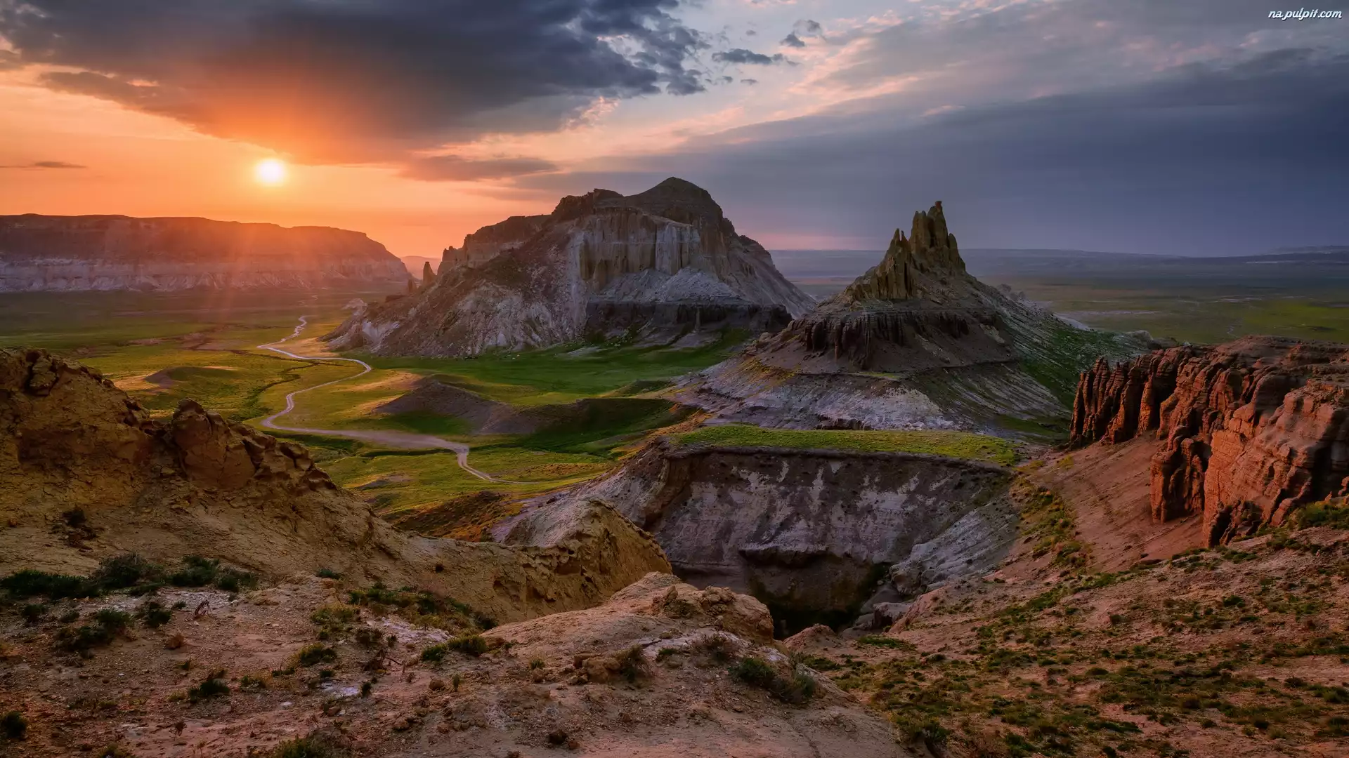 Dolina Zamków, Kazachstan, Skały, Airakty, Manggystau, Zachód słońca Na Pulpit