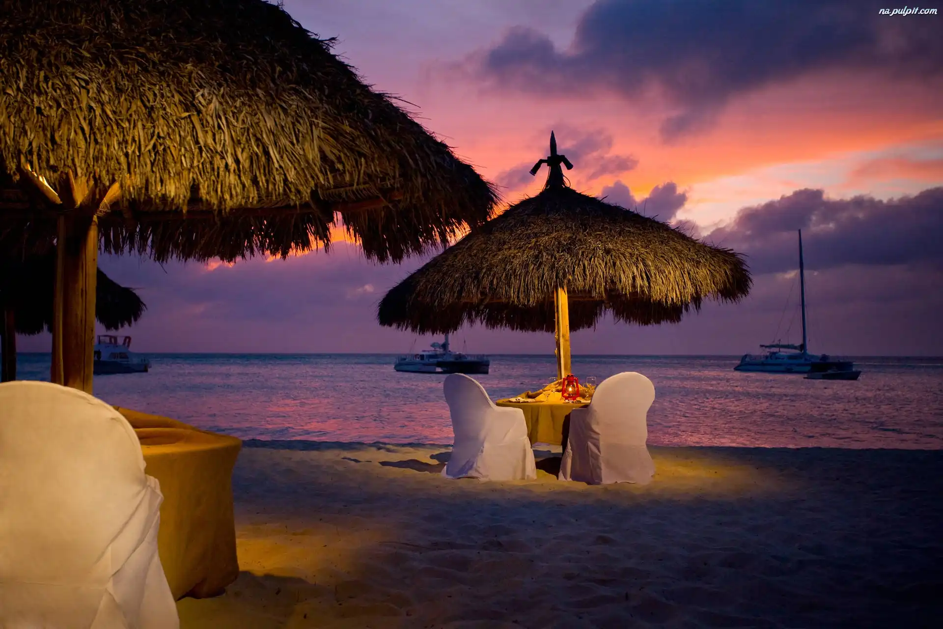Kolacja, Słońca, Romantyczna, Plaża, Morze, Zachód, Parasole