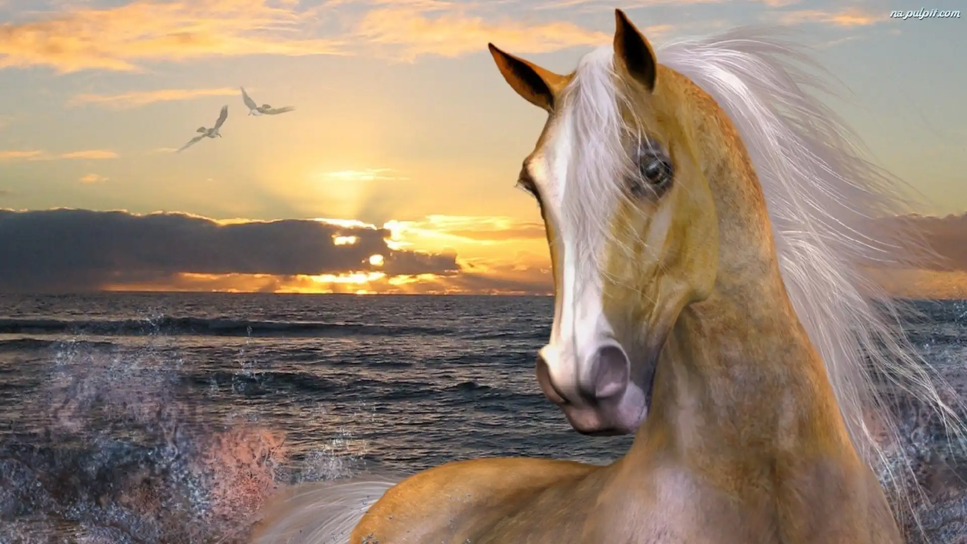 Słońca, Ptaki, Woda, Koń, Zachód Na Pulpit
