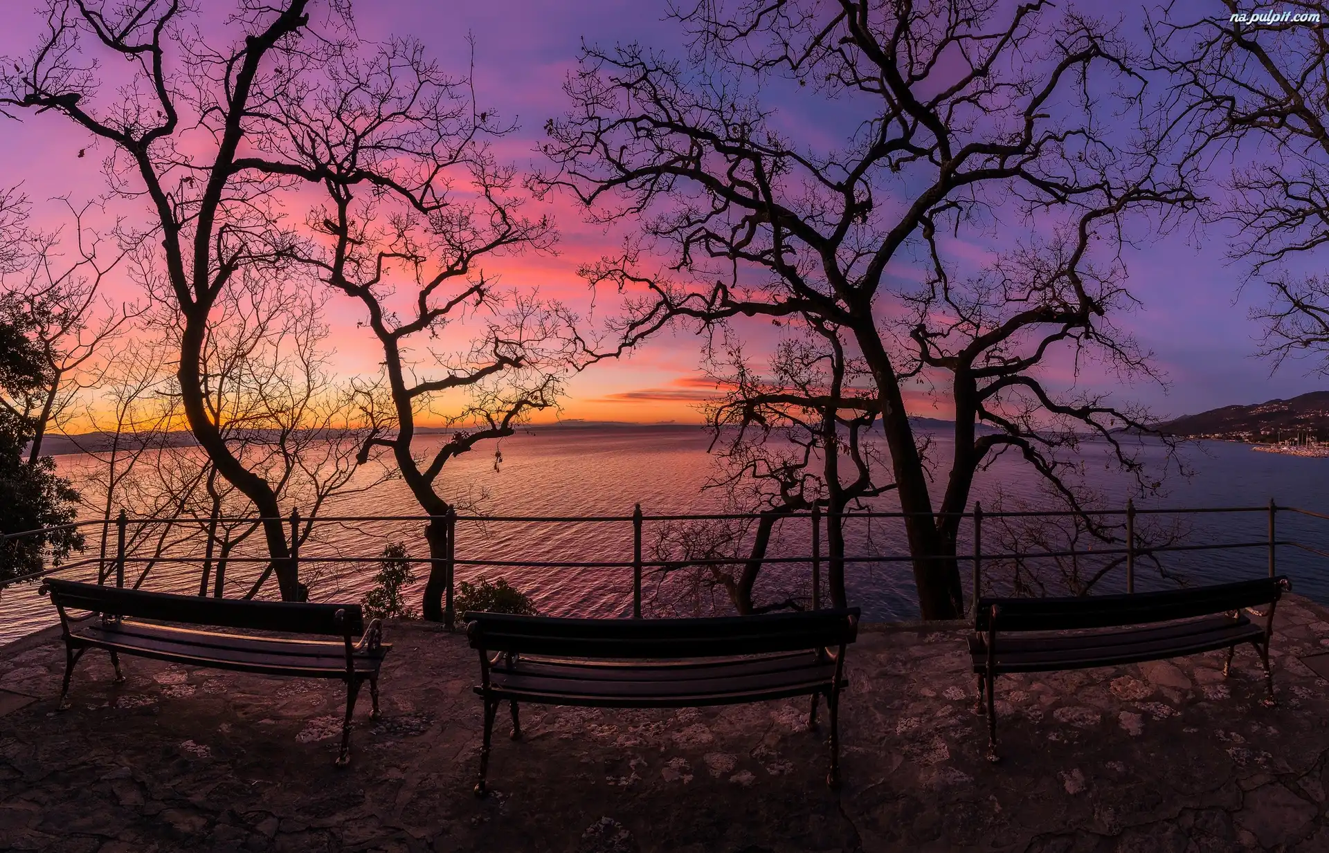 Chorwacja, Zatoka Kvarner, Opatija, Ławki, Drzewa, Jezioro, Zachód słońca Na Pulpit