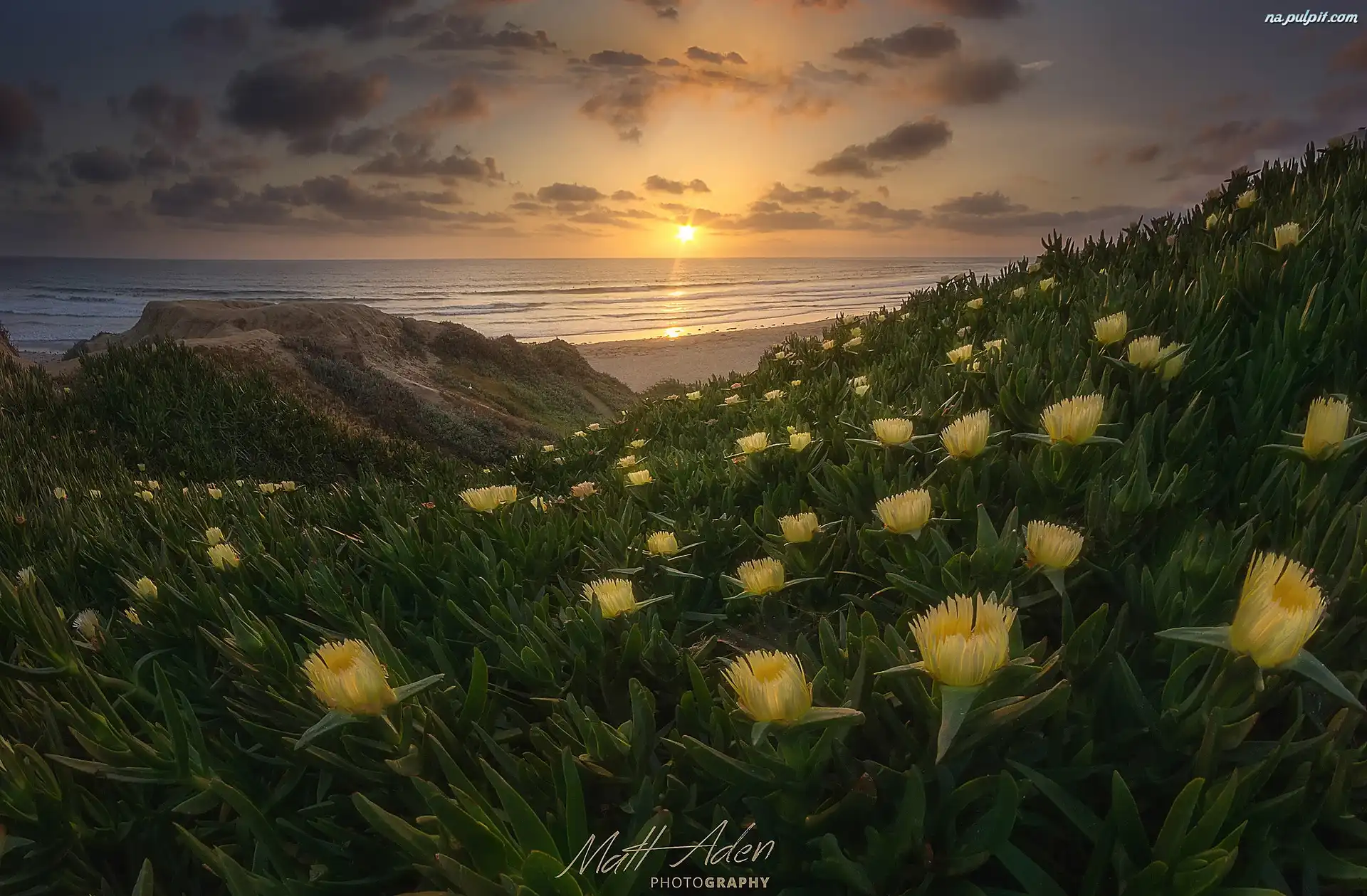 Żółte kwiaty, Zachód słońca, Morze Na Pulpit