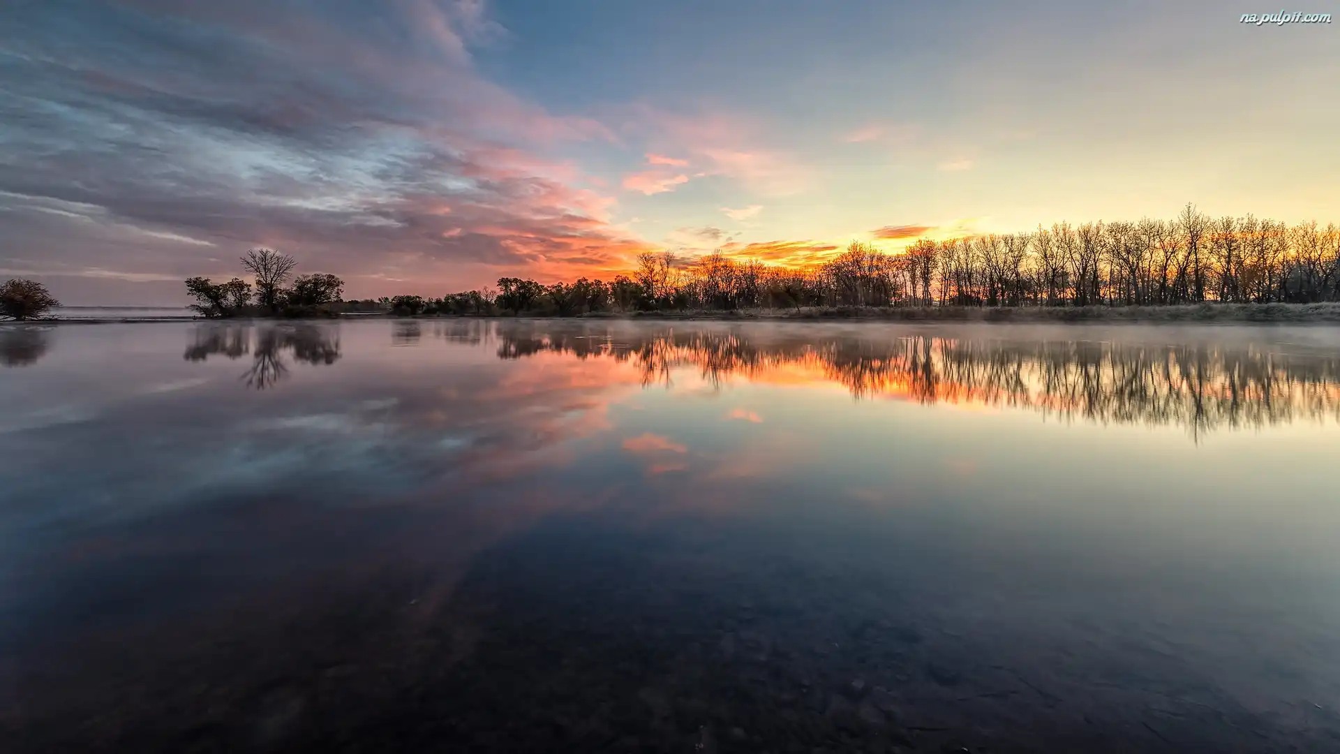 Jezioro, Park stanowy, Chatfield Lake, Stany Zjednoczone, Wschód słońca, Drzewa, Kolorado, Chatfield State Park Na Pulpit |