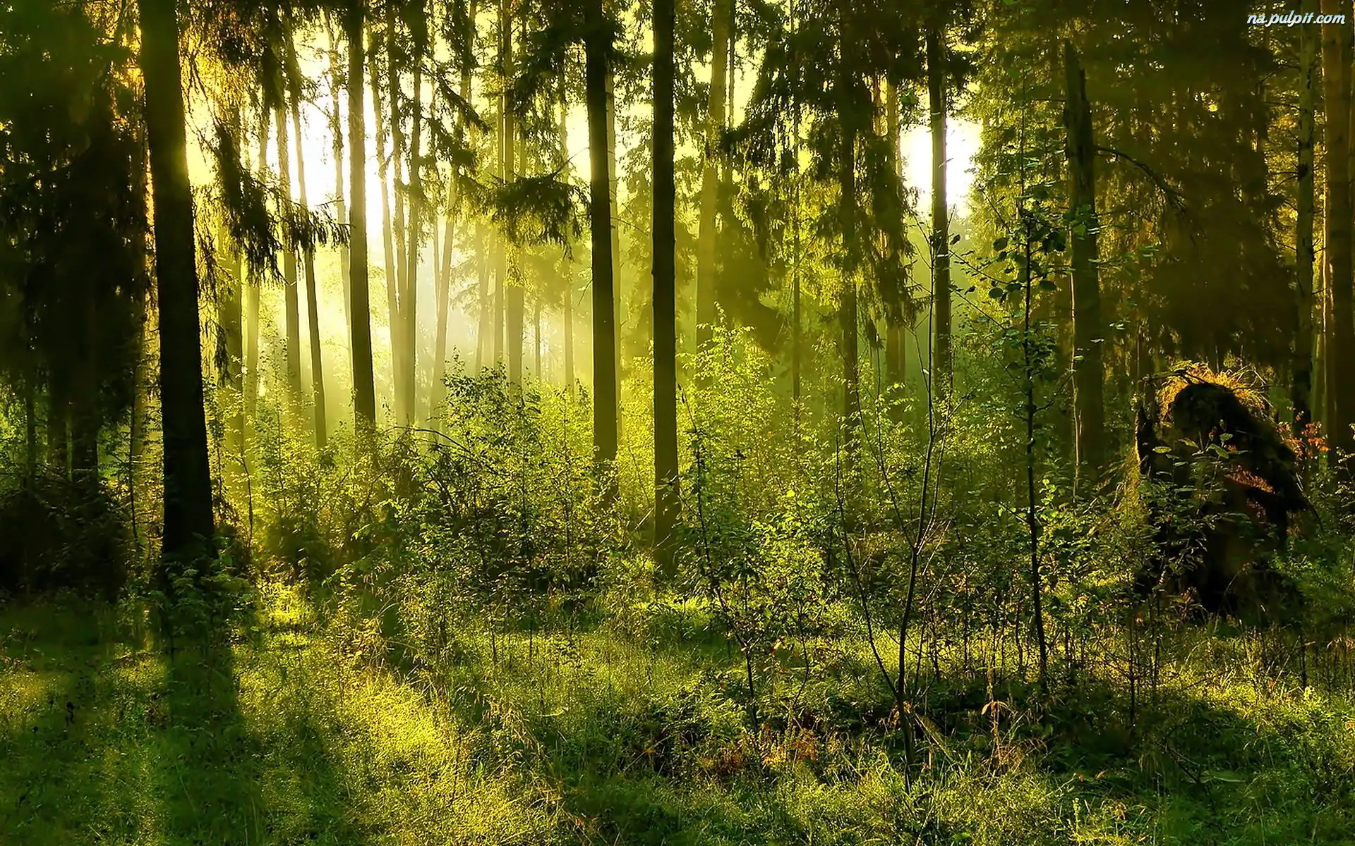 Słońca, Krzewy, Drzewa, Las, Promienie