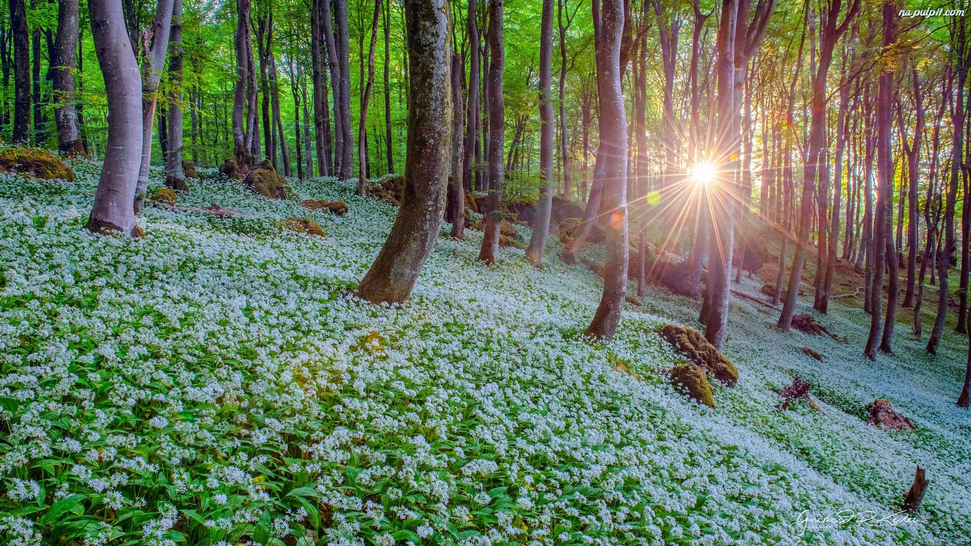 Czosnek niedźwiedzi, Las, Kwiaty, Biały, Drzewa, Promienie słońca Na Pulpit