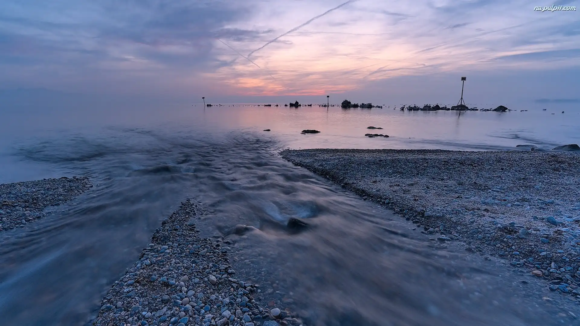 Wschód słońca, Morze, Kamienie, Plaża Na Pulpit