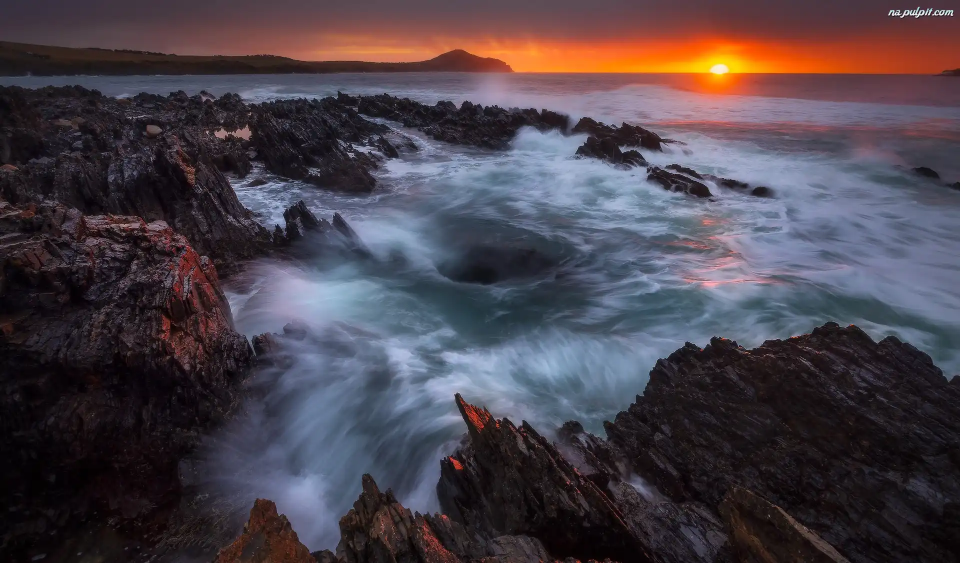 Zachód słońca, Morze, Fale, Skały Na Pulpit