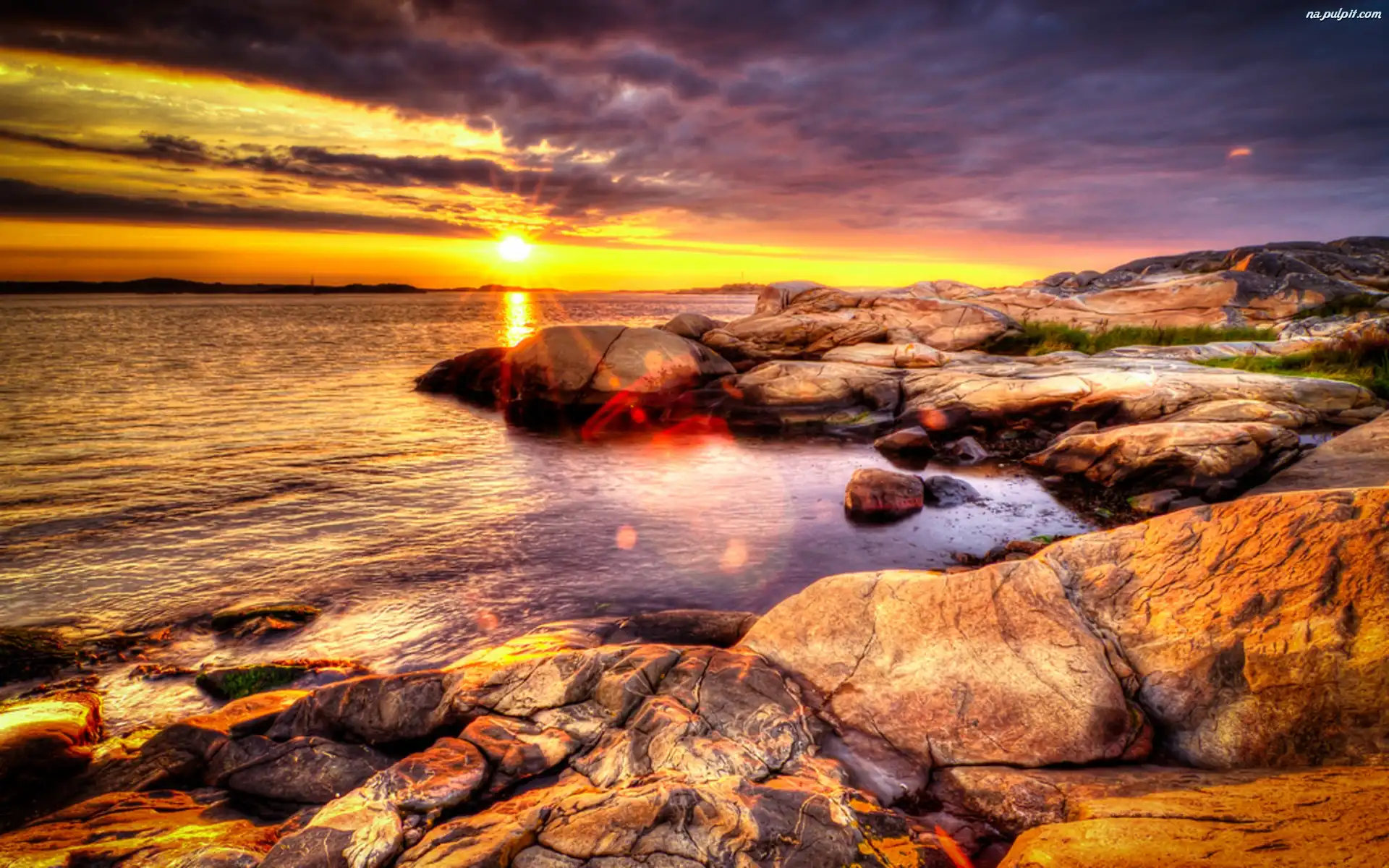 Słońca, Piękny, Skały, Morze, Zachód Na Pulpit