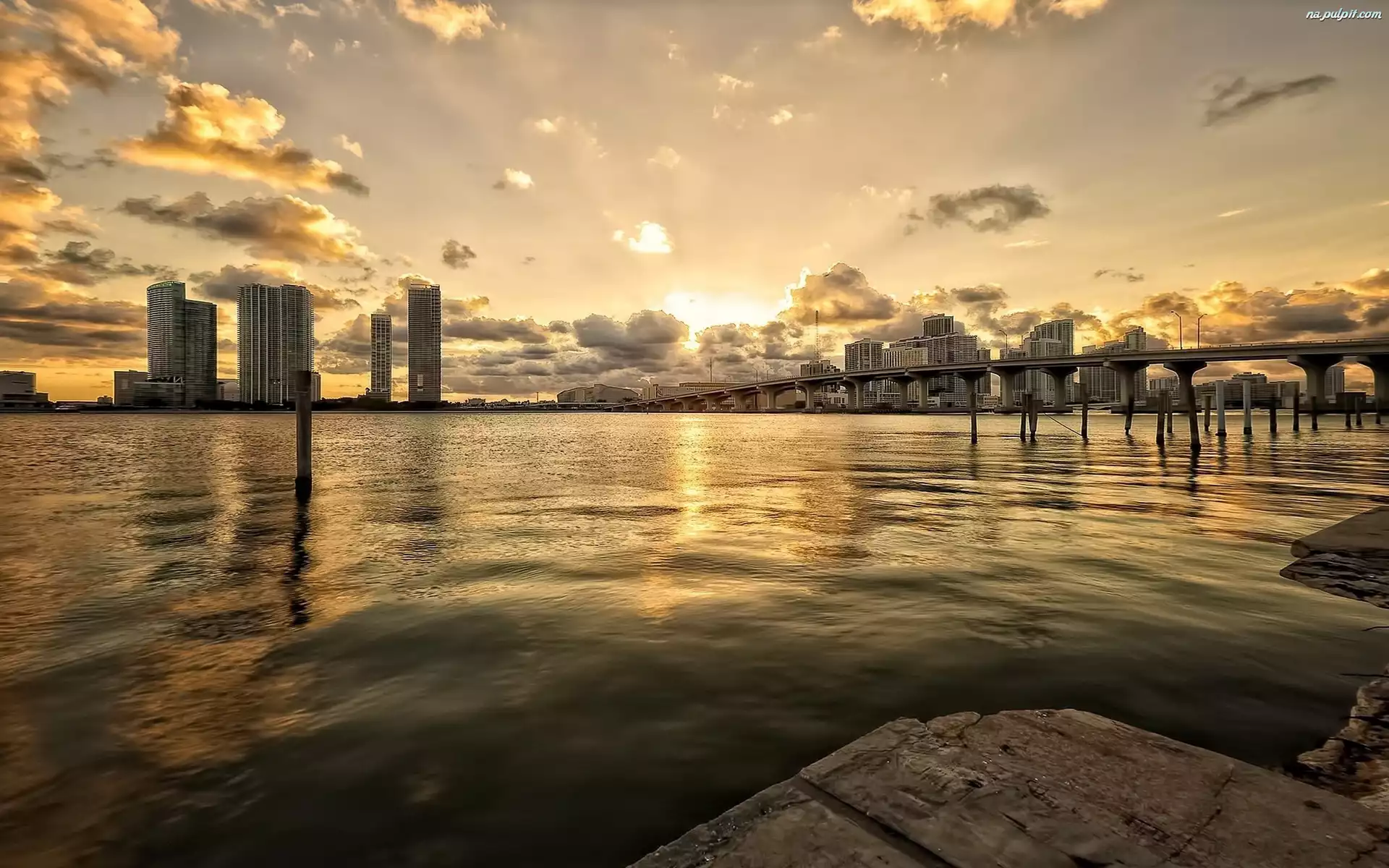 Słońca, Miasto, Woda, Most, Wschód Na Pulpit