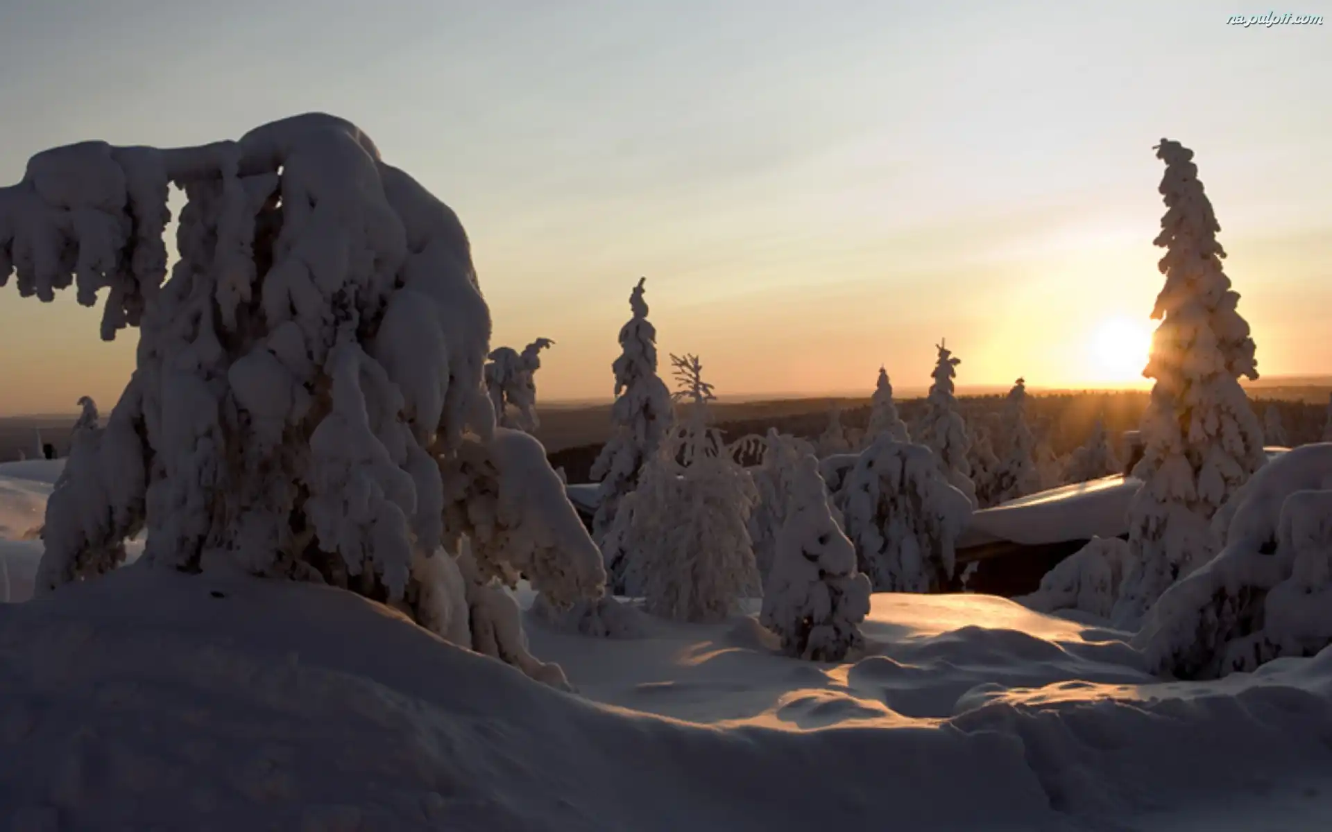 Słońca, Drzewa, Ośnieżone, Zachód Na Pulpit