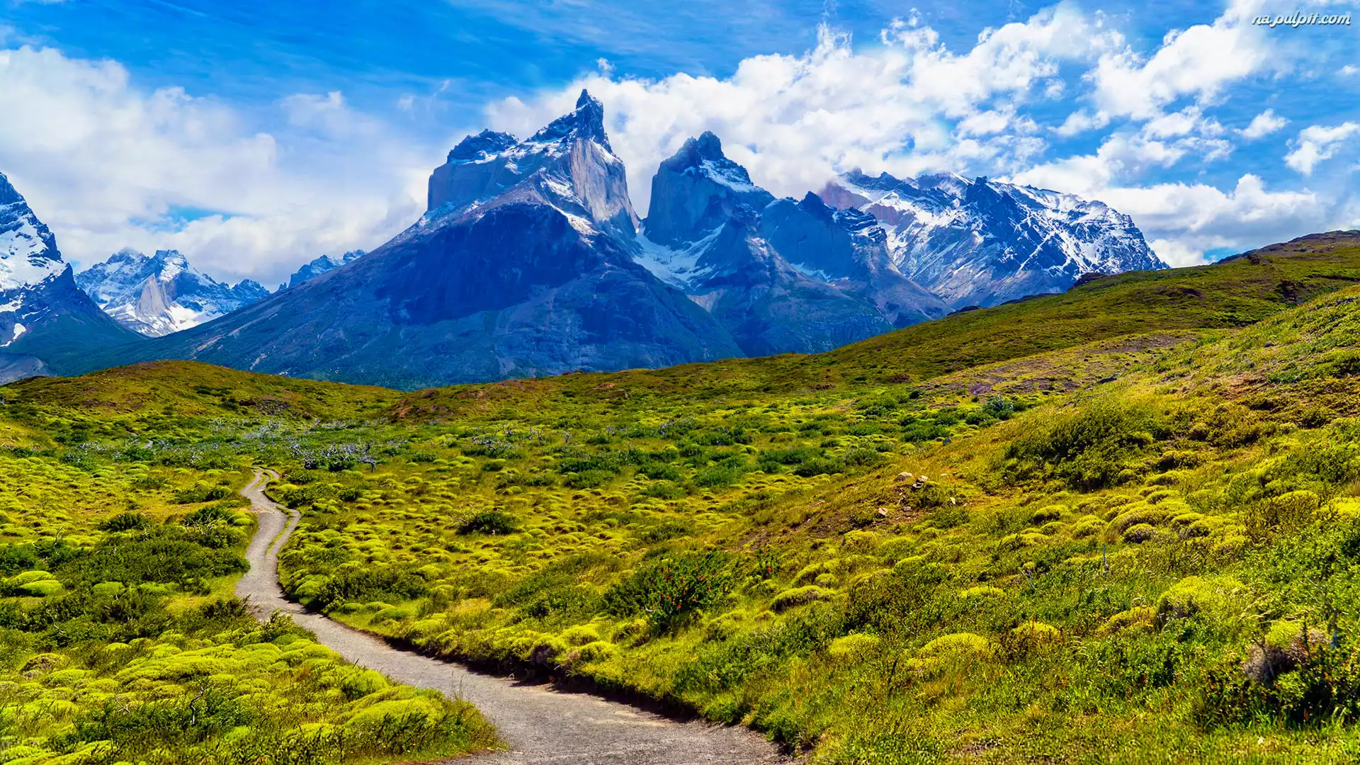 Patagonia, Torres del Paine, Chile, Masyw, Łąka, Park Narodowy Torres del Paine, Góry, Droga, Chmury, Zachód słońca Na Pulpit |