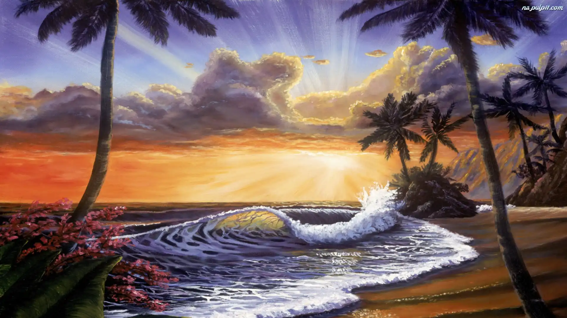 Słońca, Palmy, Fale, Plaża, Zachód Na Pulpit