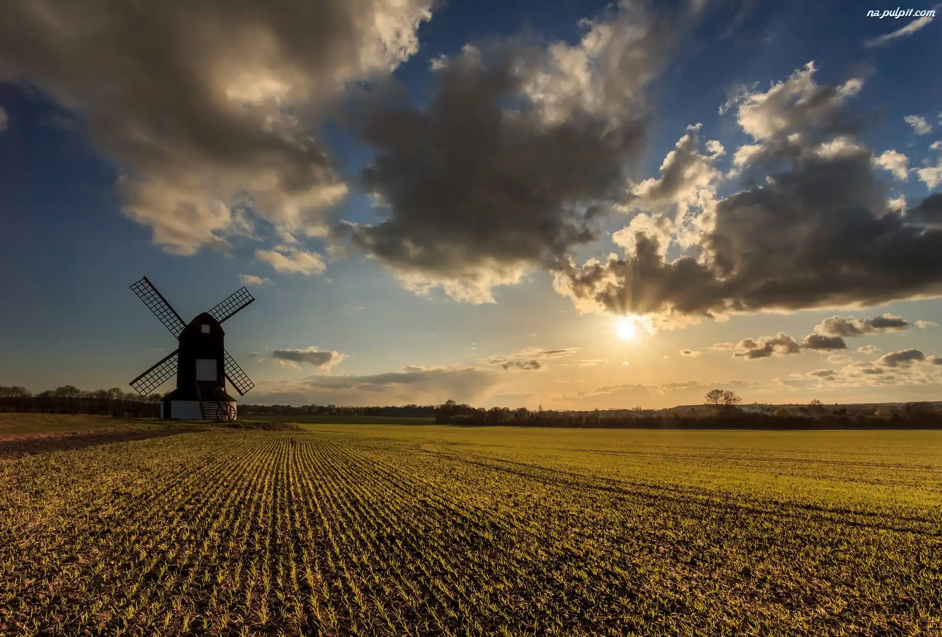 Słońca, Chmury, Wiatrak, Pole, Zachód