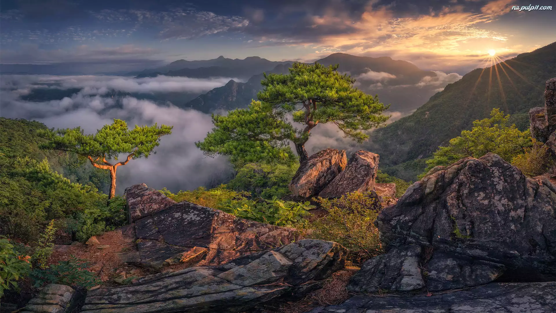 Drzewa, Góry, Promienie słońca, Mgła, Skały, Sosny Na Pulpit