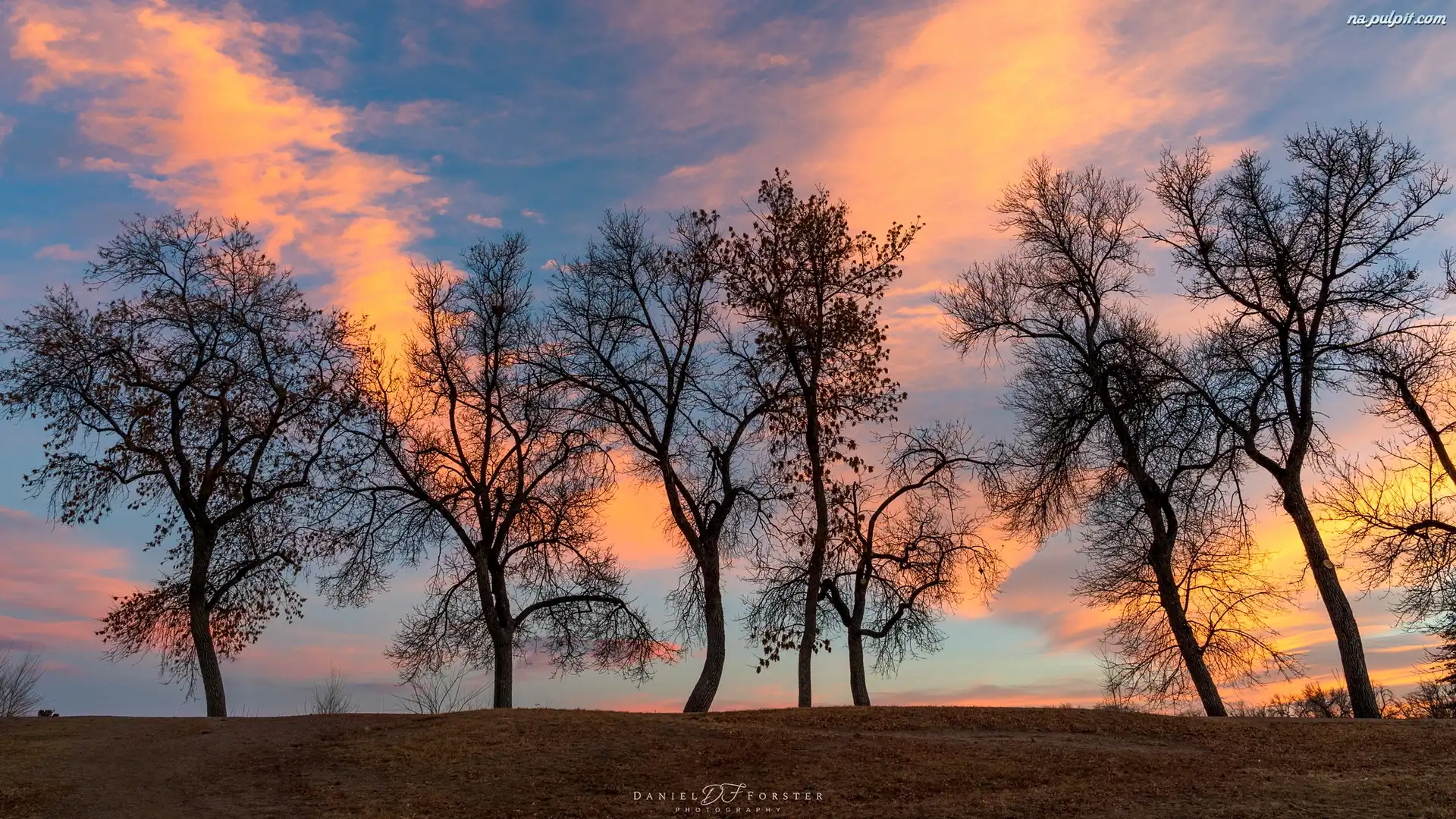 Zachód słońca, Rozświetlone, Chmury, Drzewa Na Pulpit