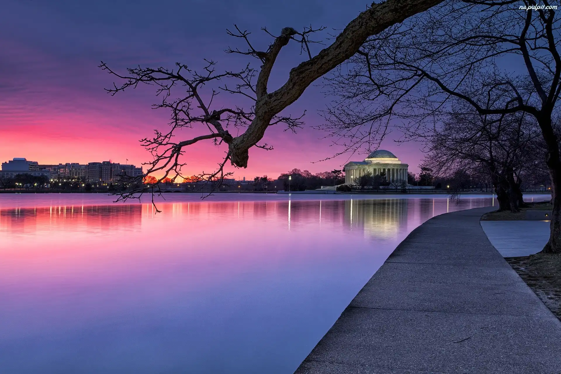 Słońca, Drzewo, Bulwar, Rzeka, Zachód
