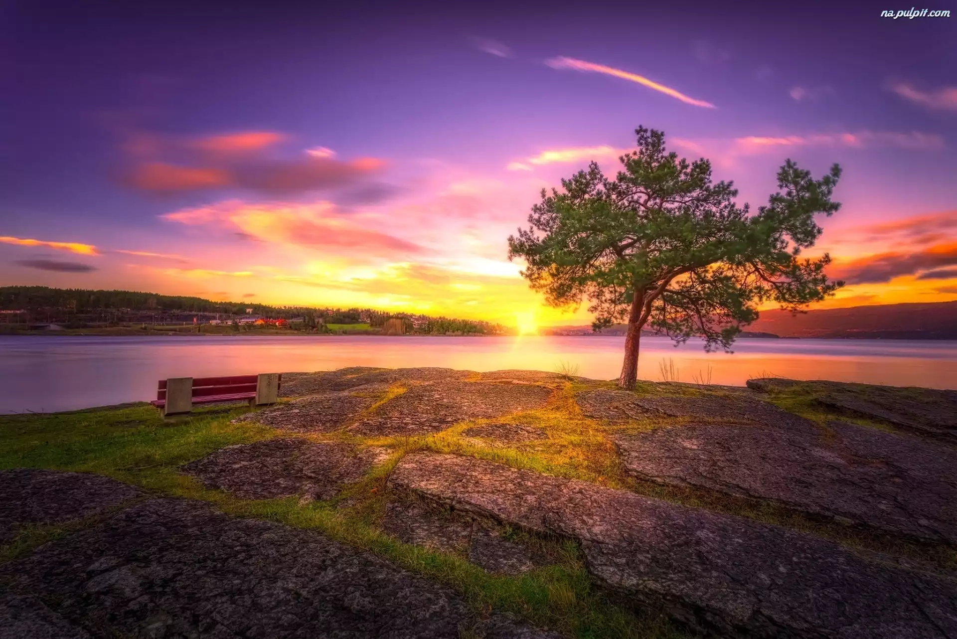 Ławka, Rzeka, Wschód słońca, Drzewo Na Pulpit