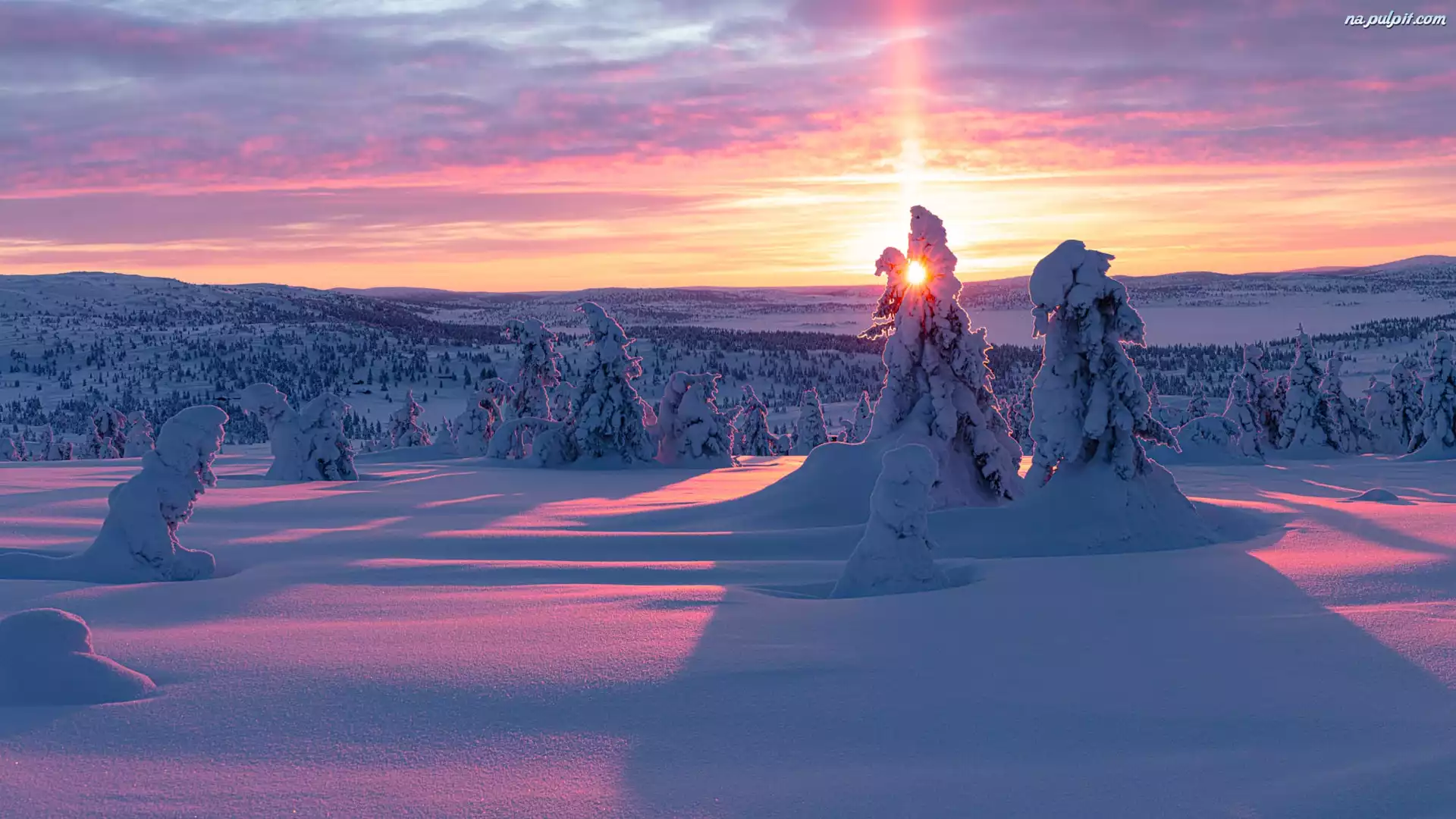 Ośnieżone, Zima, Wschód słońca, Drzewa, Śnieg Na Pulpit