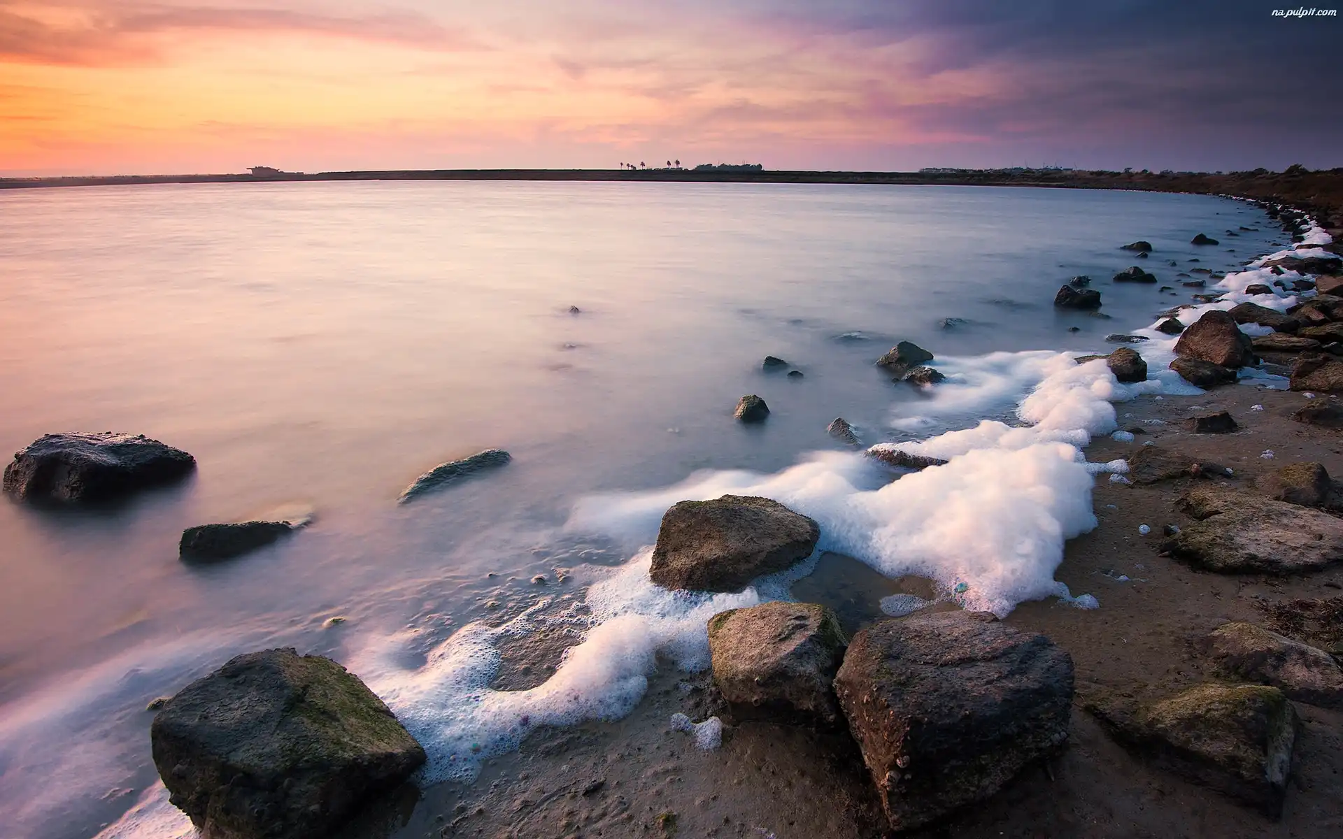 Słońca, Kamienie, Woda, Spieniona, Zachód