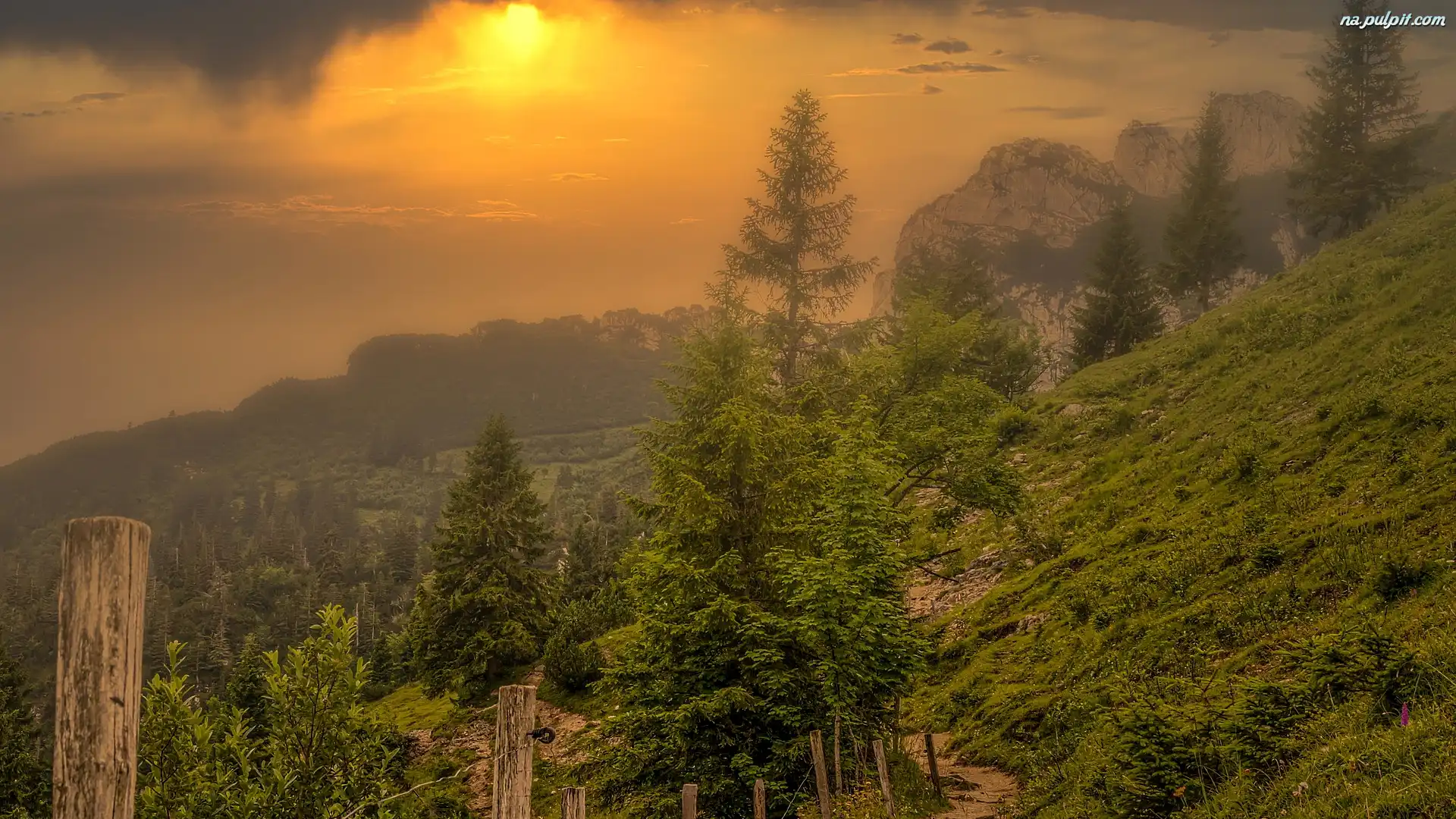 Wschód słońca, Drzewa, Mgła, Droga, Krzewy, Góry, Szlak Na Pulpit
