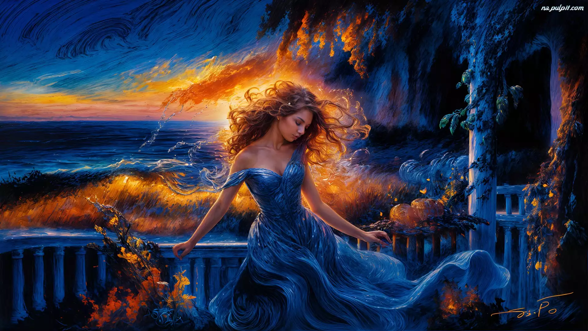Grafika, Morze, Taras, Kobieta, Niebieska, Suknia, Zachód słońca Na Pulpit