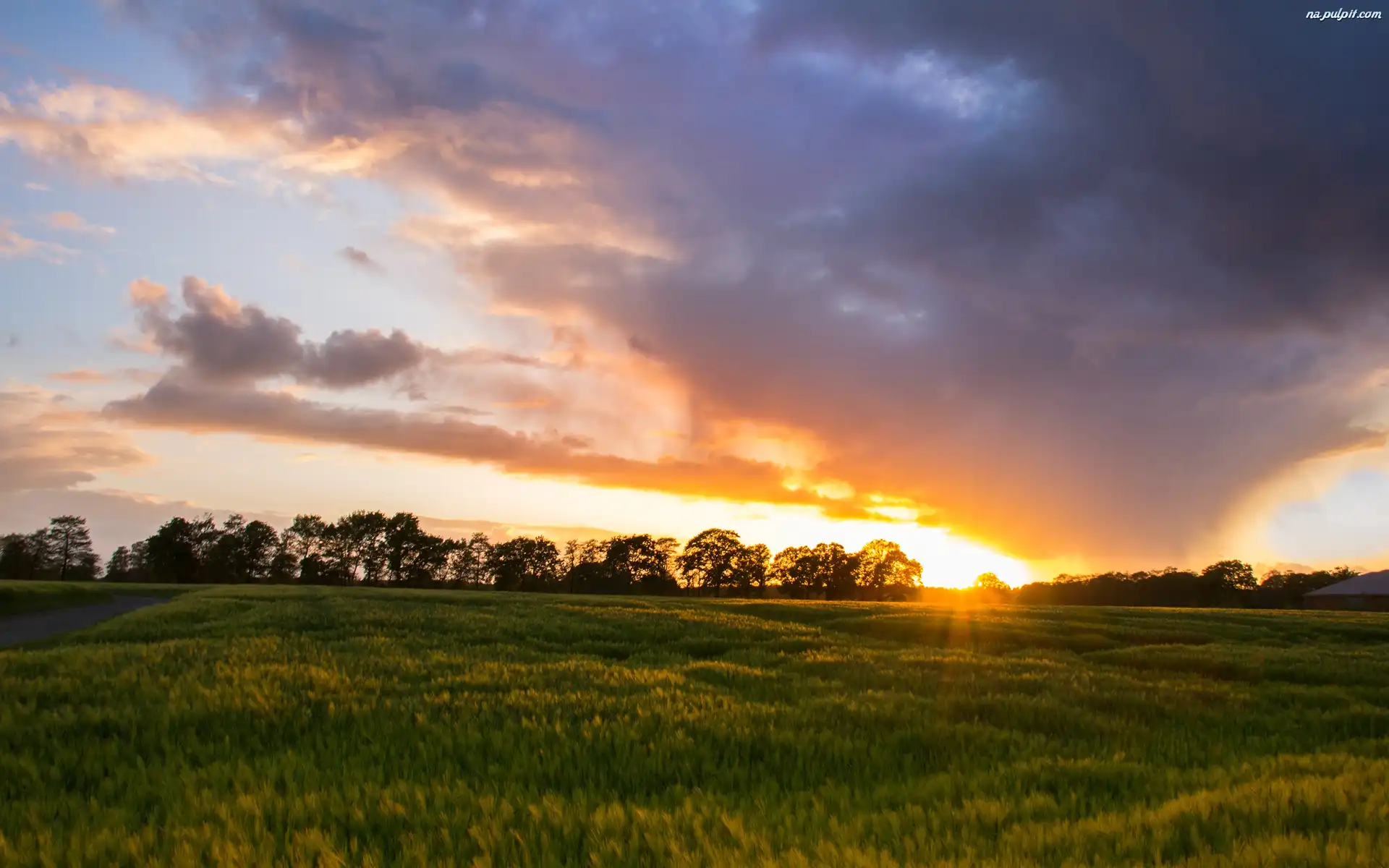 Wschód słońca, Niebo, Chmury, Droga, Łąka, Drzewa