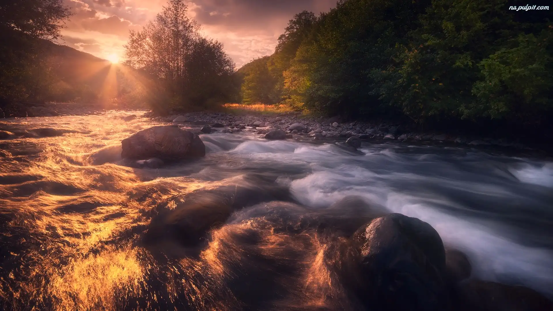 Wschód słońca, Promienie słońca, Kamienie, Rzeka, Drzewa Na Pulpit