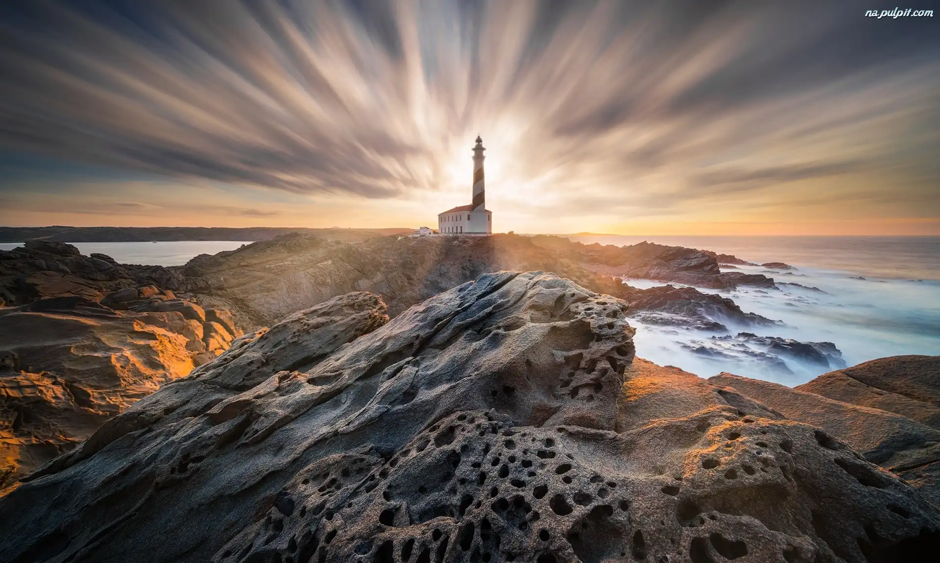 Wschód słońca, Latarnia morska Favaritx, Hiszpania, Skały Na Pulpit