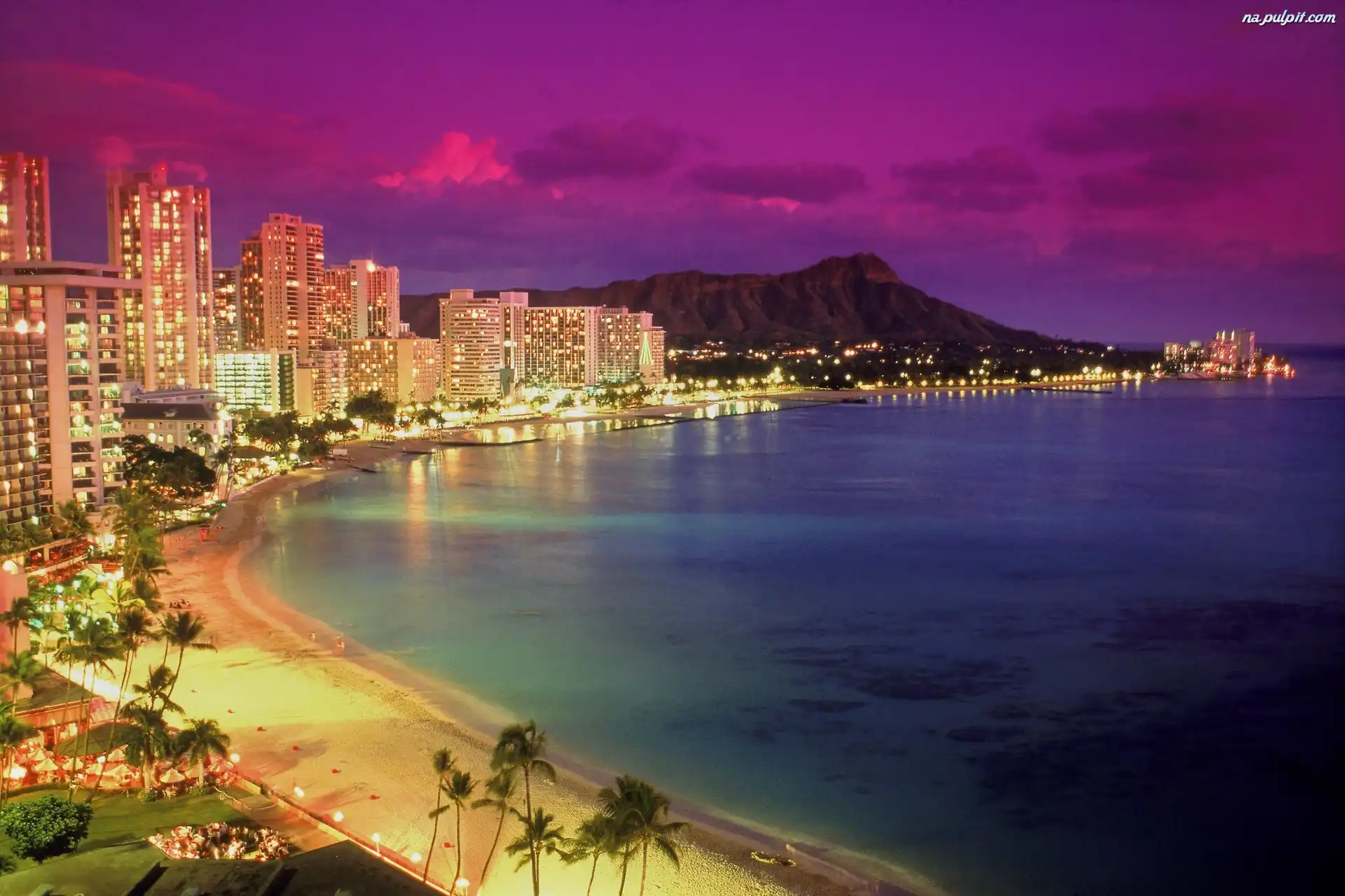 Słońca, Hawaje, Waikiki, Wyspa, Zachód