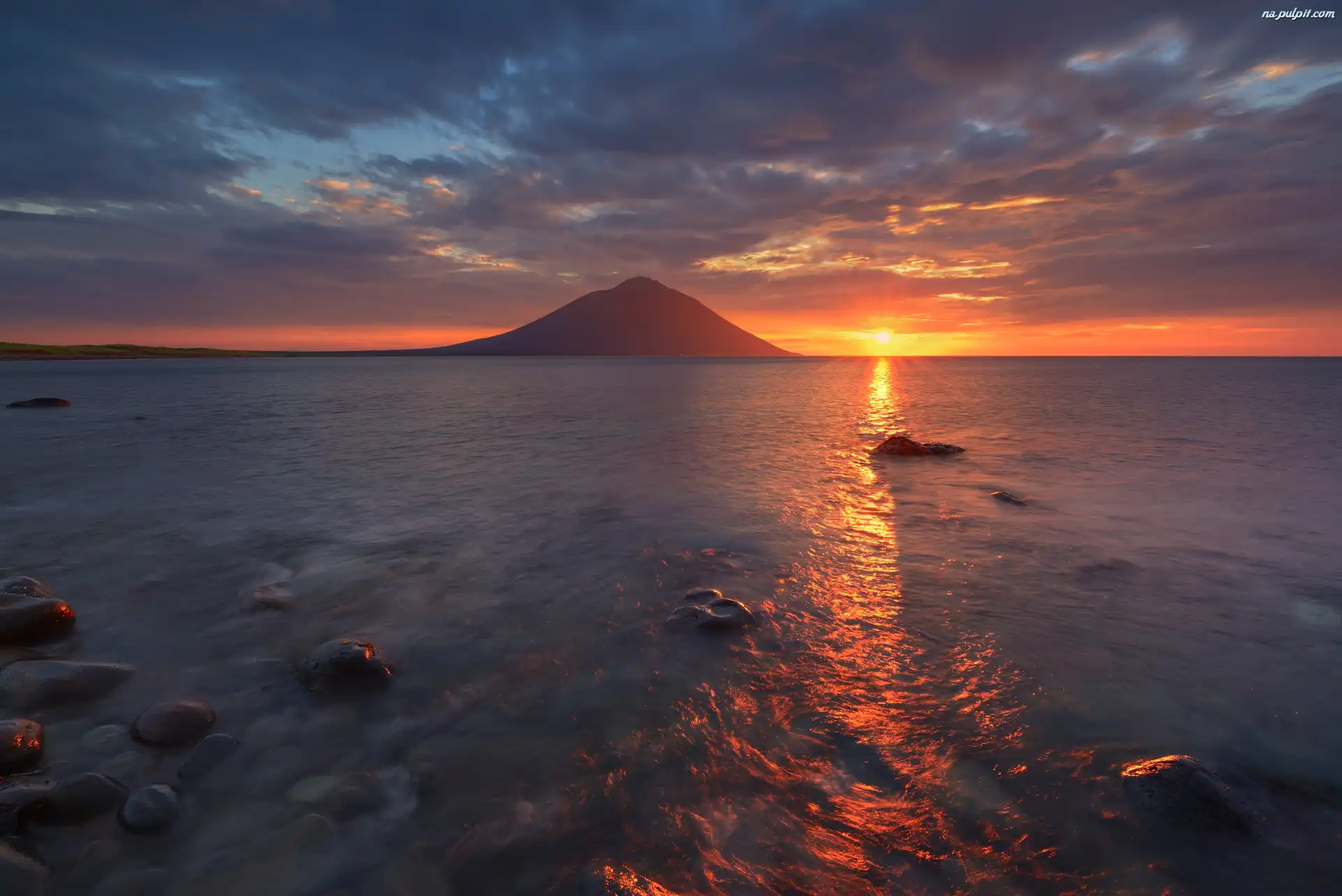 Wyspa Iturup, Góra, Zachód słońca, Morze, Obwód sachaliński, Rosja, Kamienie, Stratowulkan Atsonupuri, Wyspy Kurylskie Na Pulpit |