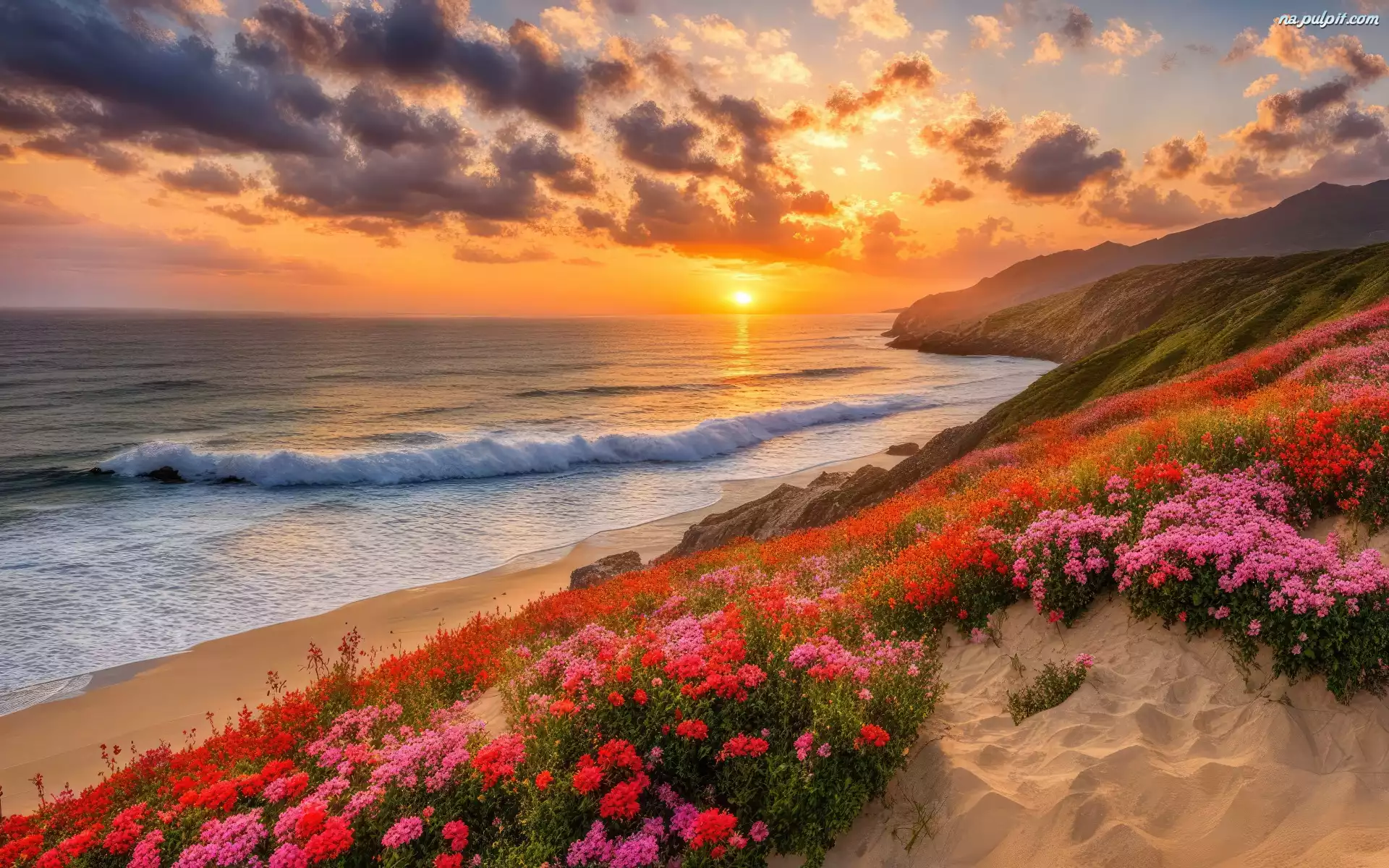 Kwiaty, Morze, Zachód słońca, Wybrzeże, Wzgórza Na Pulpit