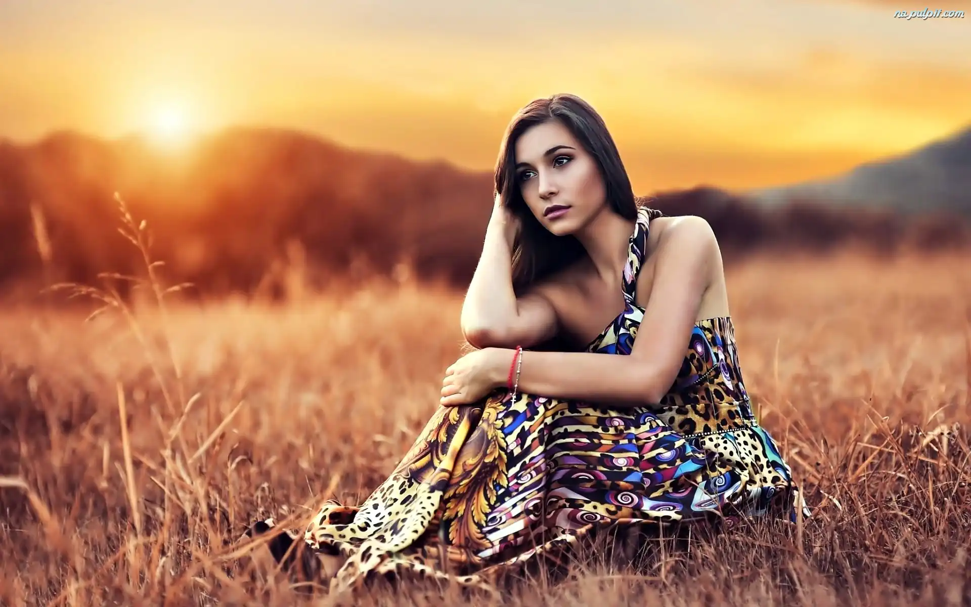 Zboże, Kobieta, Wzorzysta, Trawy, Pole, Sukienka, Zamyślona, Zachód Słońca Na Pulpit