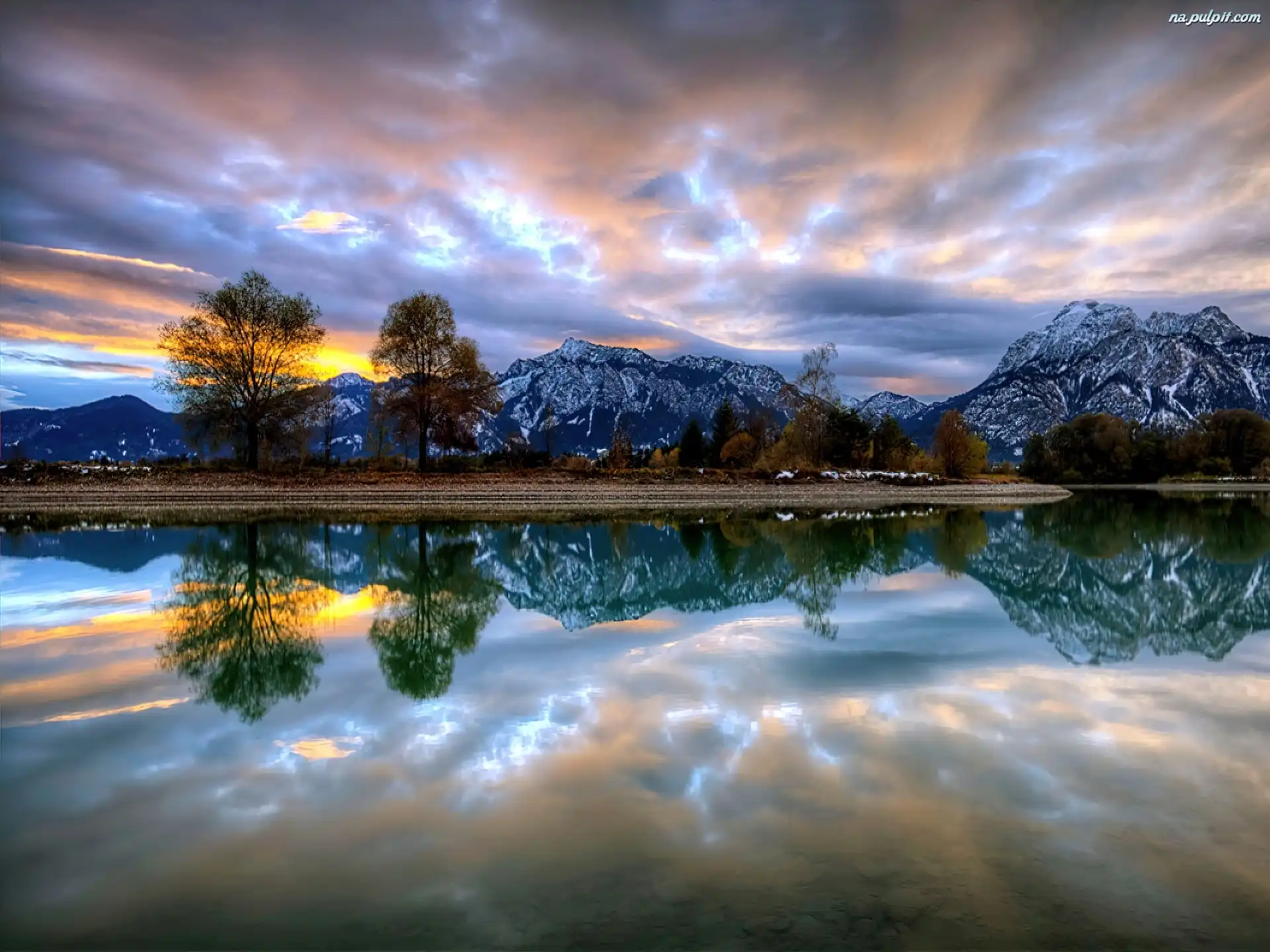 Słonca, Jeziora, Góry, Odbicie, Zachód, Woda Na Pulpit