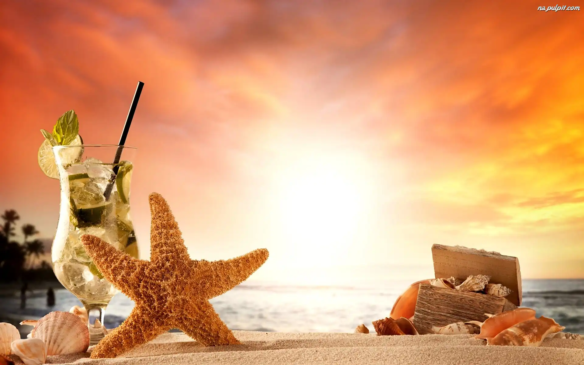Zachód Słońca, Rozgwiazda, Drink Mojito, Plaża, Kompozycja Na Pulpit