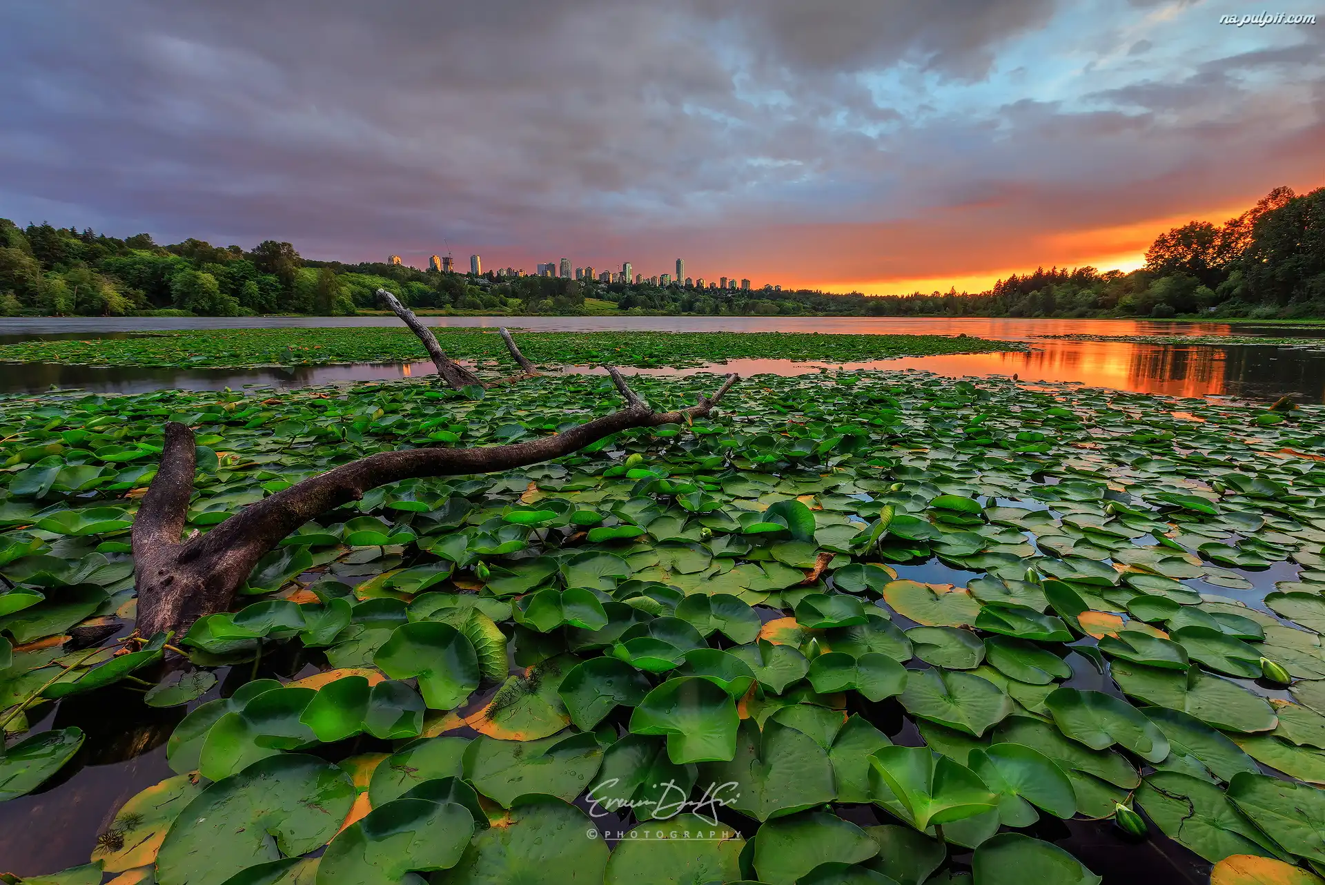 Zachód słońca, Lilie wodne, Liście, Staw, Konar Na Pulpit