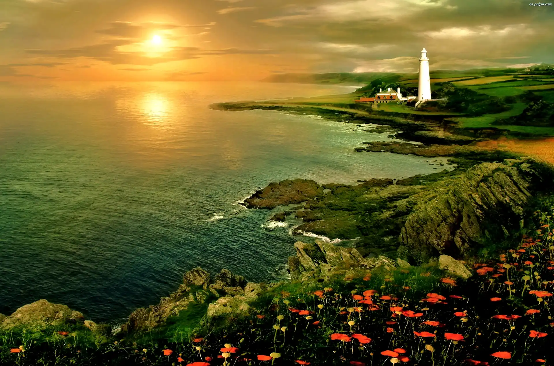 Słońca, Wybrzeże, Kwiaty, Latarnia, Zachód, Morska Na Pulpit
