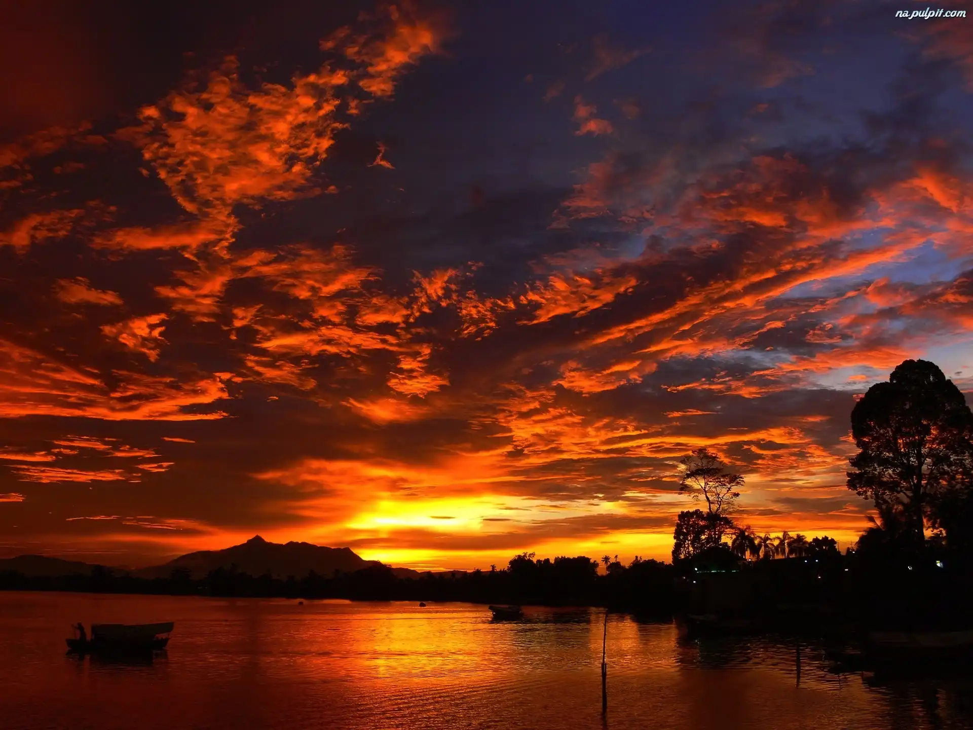 Słońca, Drzewa, łódź, Chmury, Zachód, Morze Na Pulpit