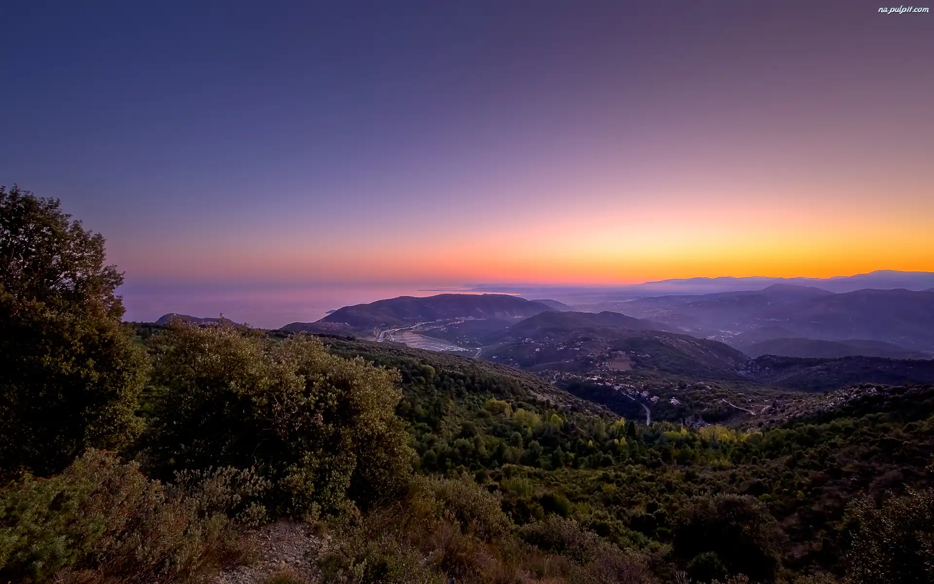 Słońca, Niebo, Miasto, Morze, Zachód, Drzewa