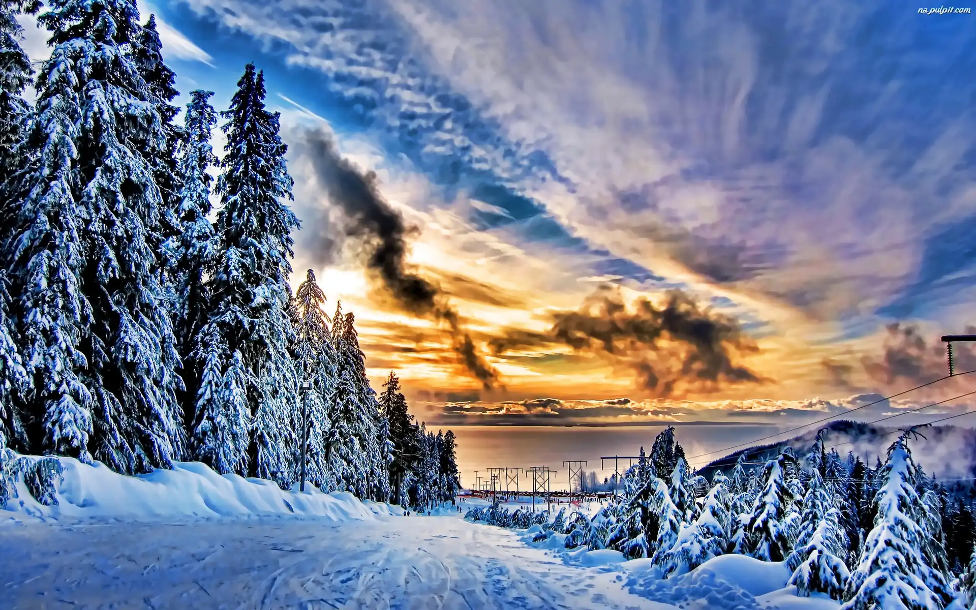 Śnieg, Zachód Słońca, Drzewa