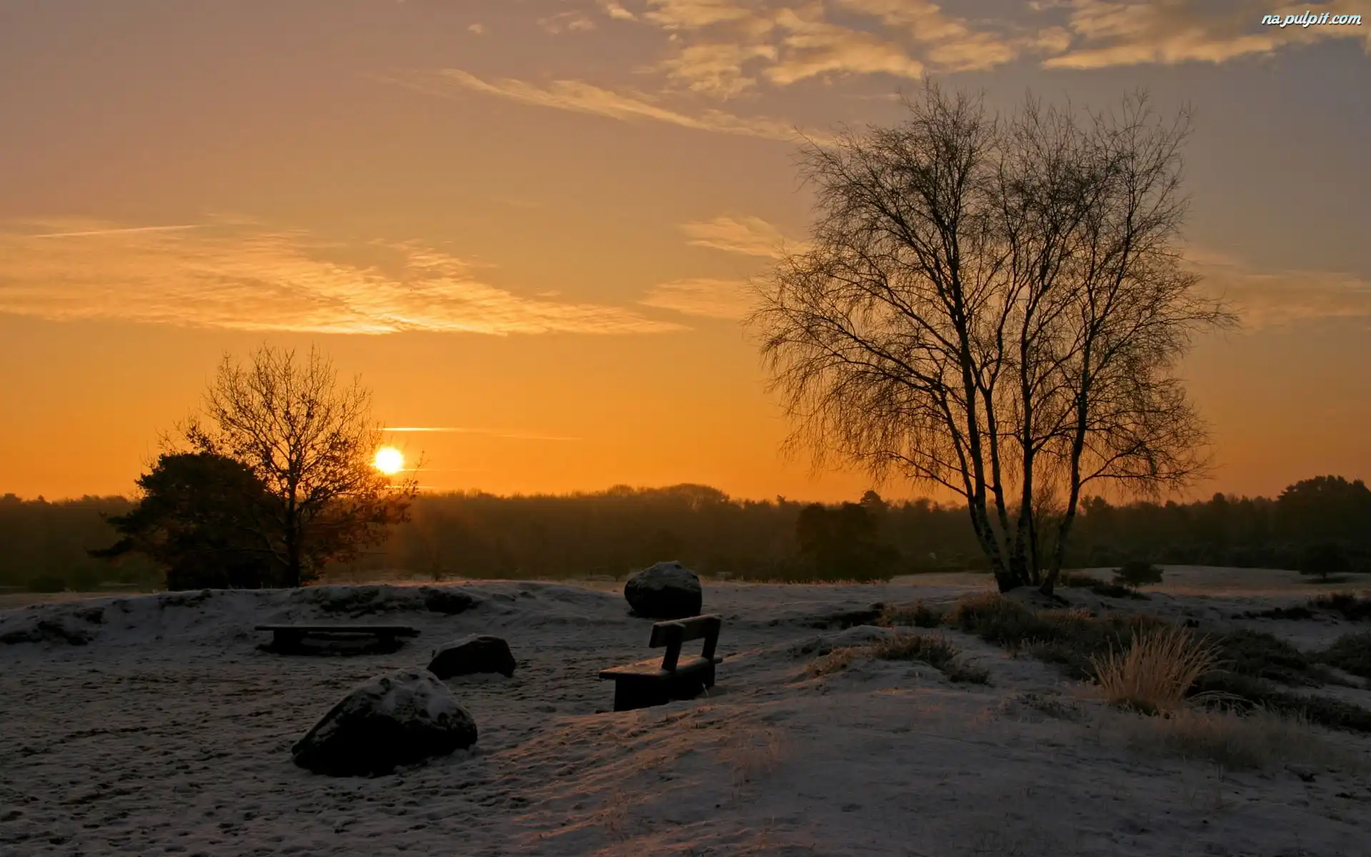 Słońca, Ławeczka, Śnieg, Drzewa, Zachód, Krzewy Na Pulpit