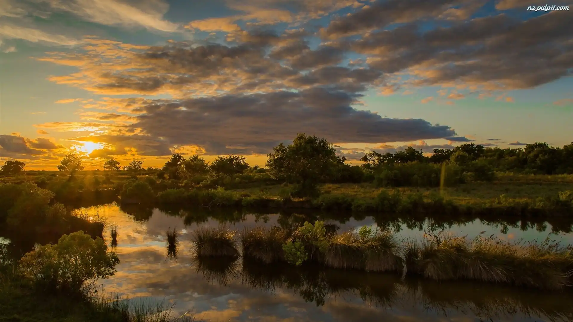 Słońca, Drzewa, Trawa, Staw, Zachód, Chmury Na Pulpit