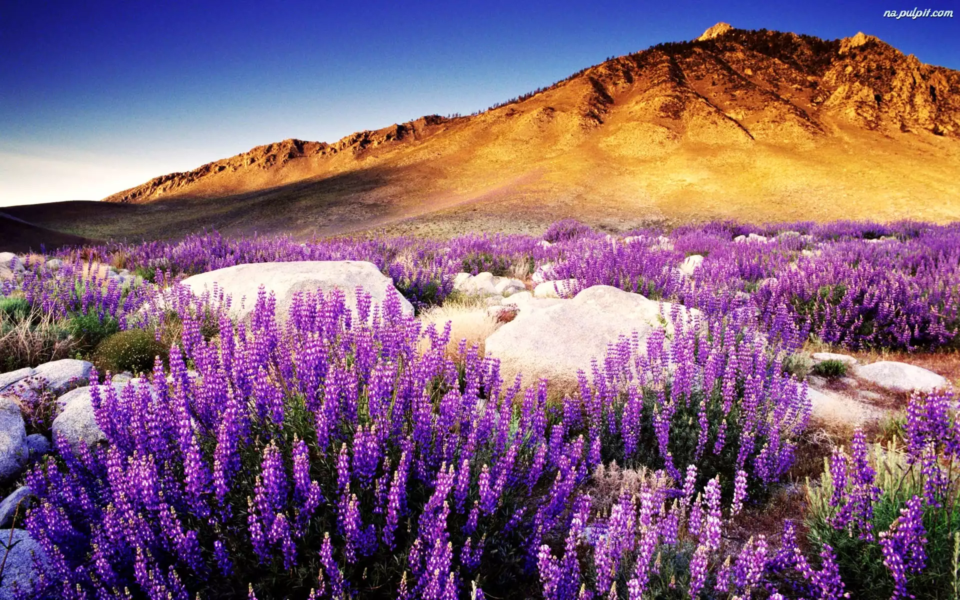 Słońca, Kwitnący, Łubin, Wzgórza, Zachód, Głazy