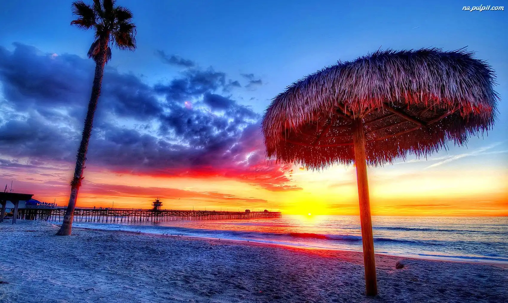 Słońca, Parasol, Wakacje, Plaża, Zachód, Molo Na Pulpit