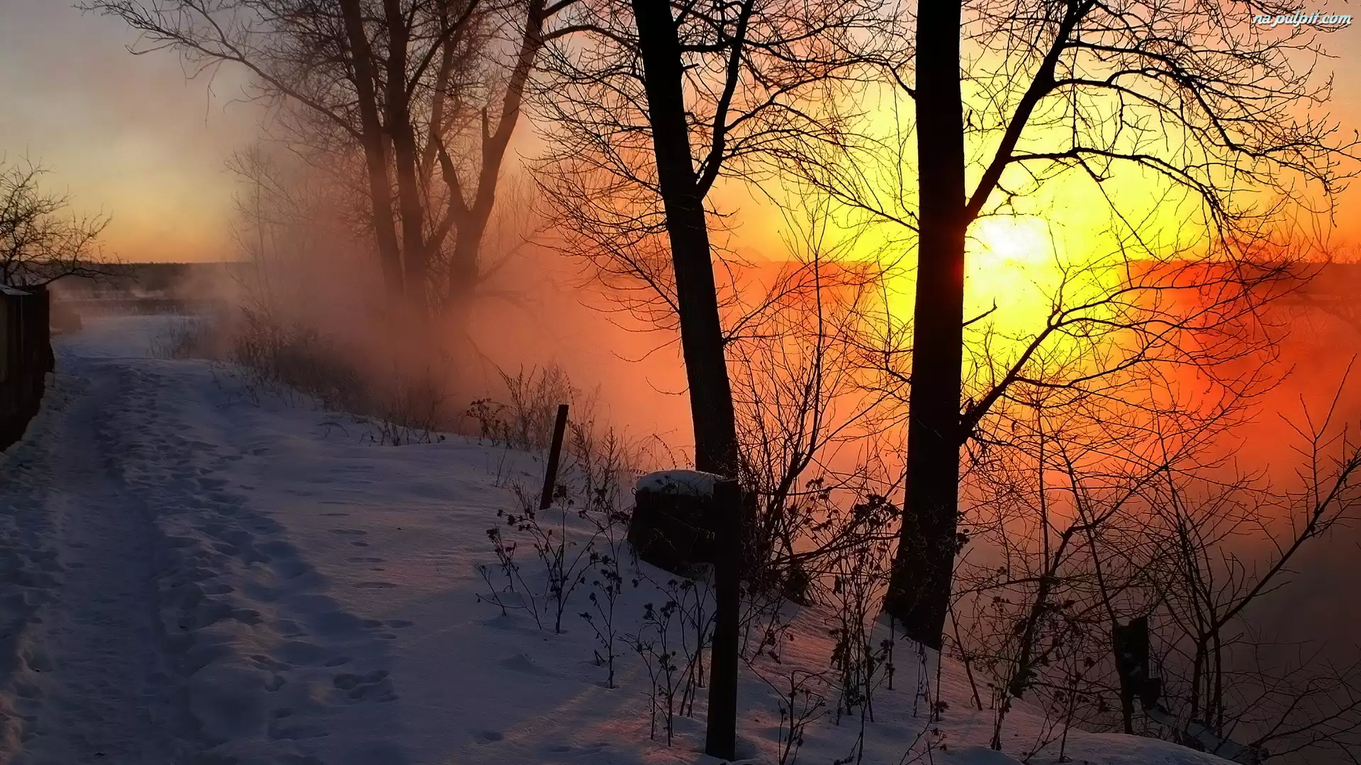 Słońca, Mgła, Zima, Dróżka, Zachód, Drzewa Na Pulpit