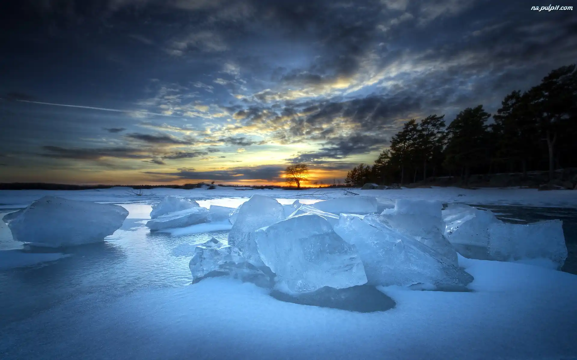 Słońca, Lodu, Zima, Las, Zachód, Bryły