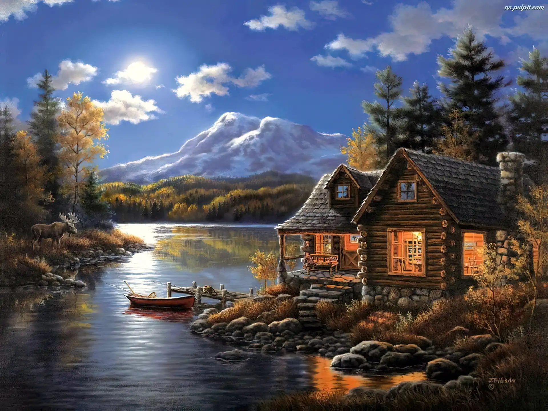 Słońce, Jezioro, Góry, Domy, Łódka Na Pulpit